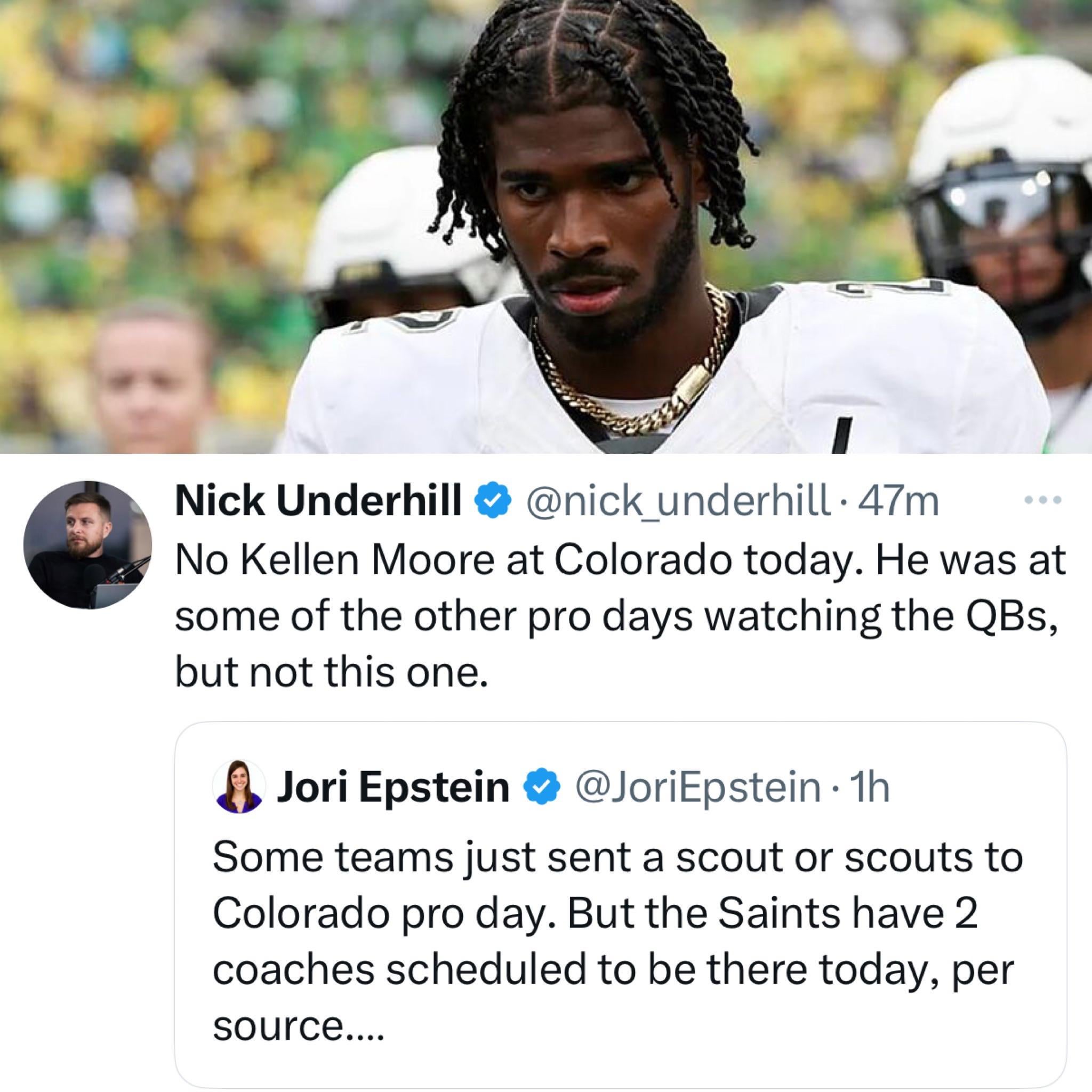 Kellen Moore not in attendance at Colorado’s NFL Showcase today👀…(QB Coach Scott Tolzien & WR Coach Keith Williams are both there)
