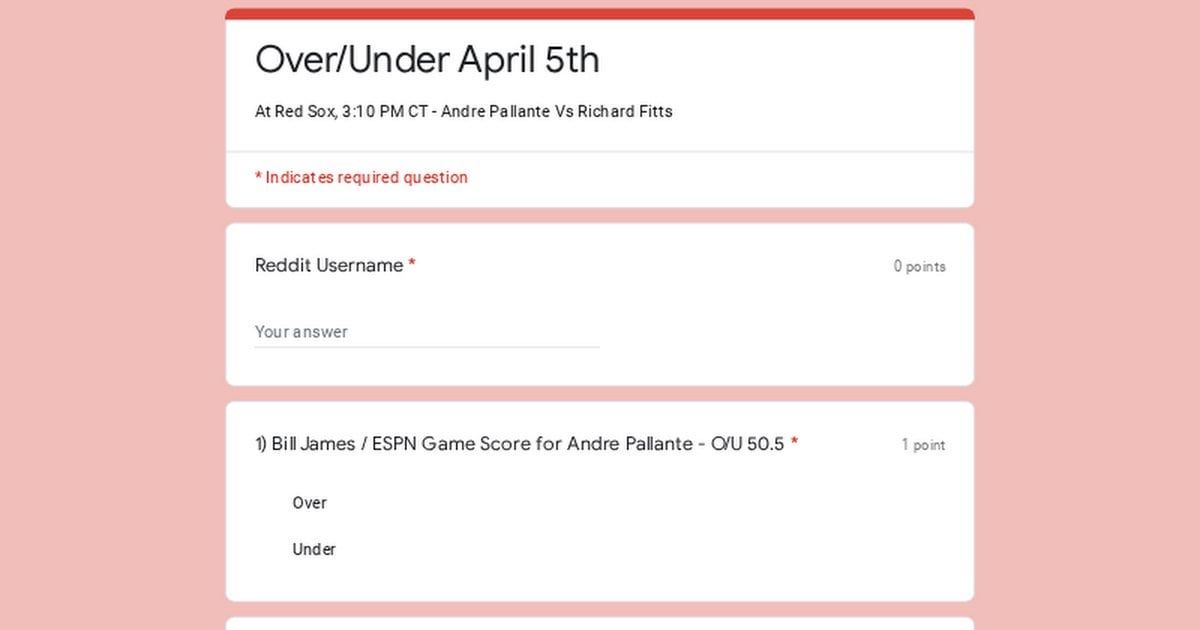 Over/Under Contest: April 5th – Vs Red Sox, 3:10 PM CT – Andre Pallante Vs Richard Fitts