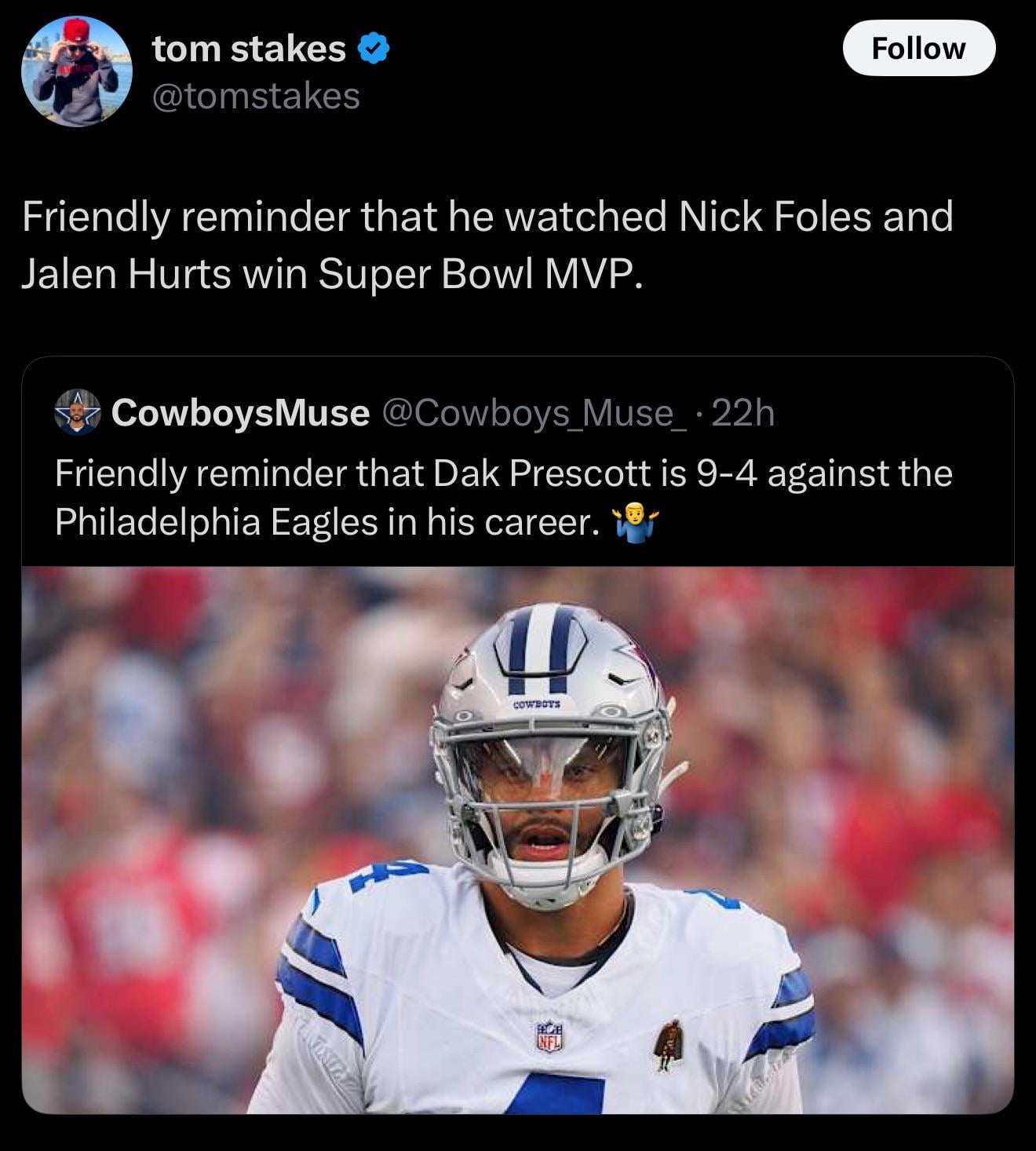 1. Dak is generational at dodging the eagles when they have a good team. Missed 4 of 6 games in the last three seasons they’ve been to the Super Bowl. The two of those he played were against Gardner minshew and Nate Sudfield
