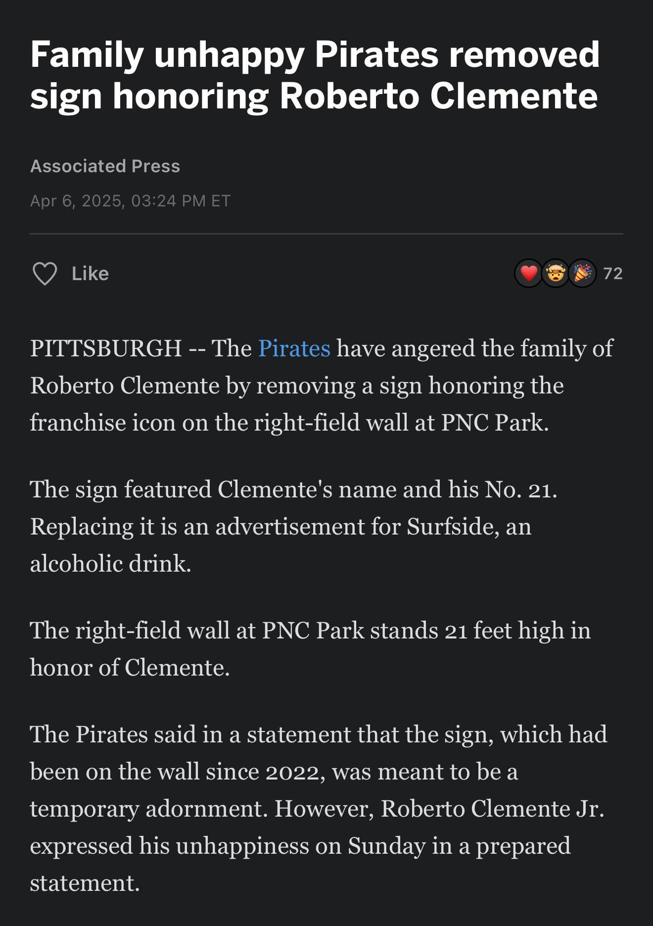 I am weary of the never-ending love affair with Clemente (Honus Wagner is the greatest Pirate ever and doesn’t receive 1/10 of the attention), but this is a terrible look for the franchise.