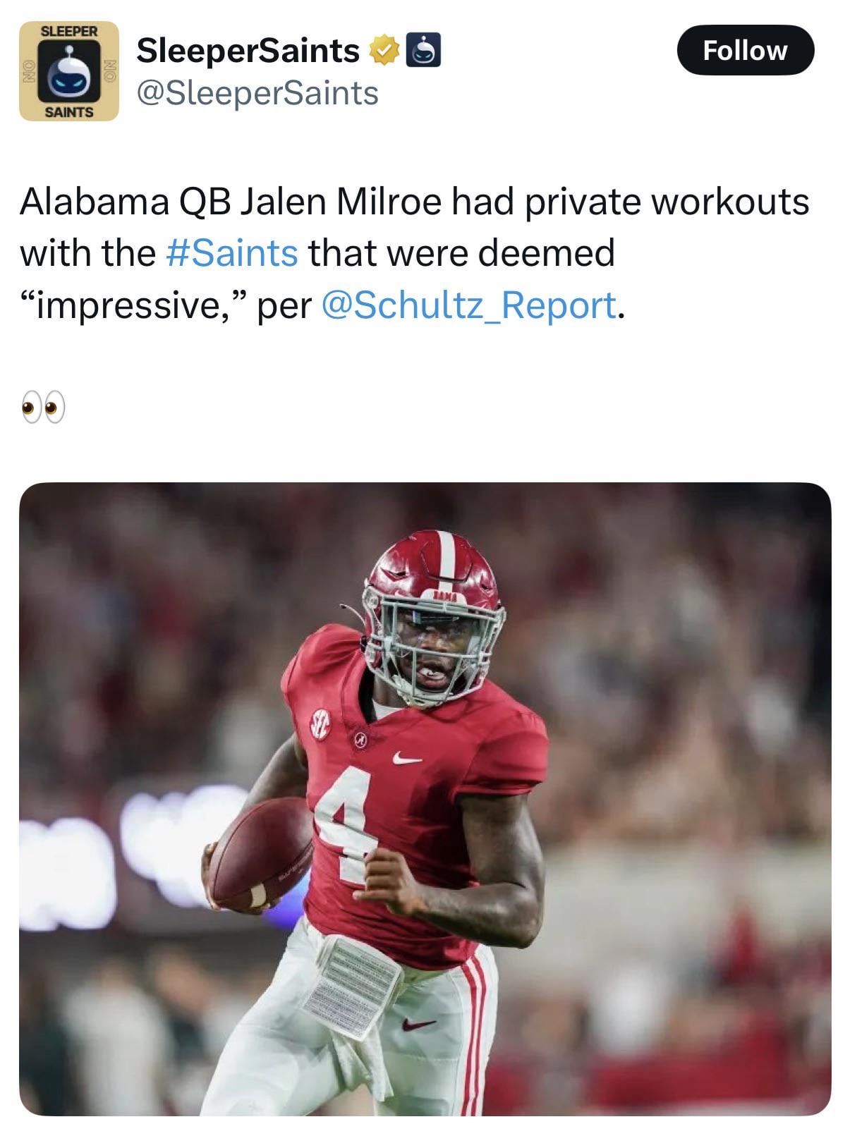 He’s perhaps the safest QB to draft. Now hear me out… Regardless of who we draft at QB they won’t be starting year 1 (except maybe if we trade up for Cam Ward?). I say Milroe is the safest pick because he would be the only one able to contribute to the team from the start in a Taysom Hill kind of role. Taysom Hill is still a question mark as well so I wouldn’t mind Taysom “mentoring” Milroe or Milroe being the new Taysom if we move on. Now year 2 would be when we would either decide to make him QB1 or keep him in the Taysom role and roll with another QB.