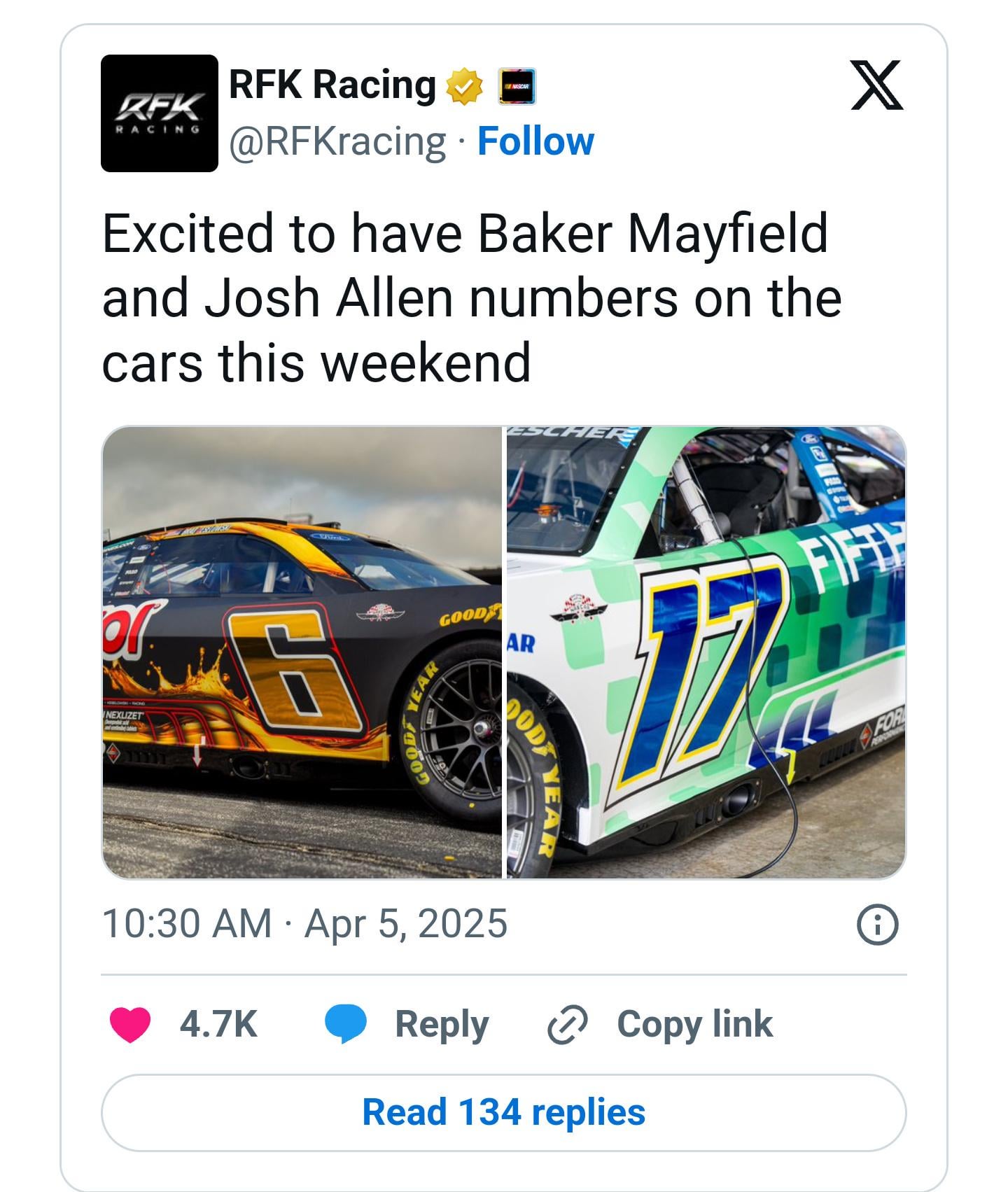 https://x.com/RFKracing/status/1908527716086821321?ref_src=twsrc%5Etfw%7Ctwcamp%5Etweetembed%7Ctwterm%5E1908527716086821321%7Ctwgr%5E82fe33b53537038da92ef100ddd775fde56975cd%7Ctwcon%5Es1_c10&ref_url=https%3A%2F%2Fwww.totalprosports.com%2Fnfl%2Fnascar-team-takes-brutal-shot-at-lamar-jackson-on-social-media-after-ravens-qb-sued-dale-earnhardt-jr%2F Leave a ReplyYou must be logged in to post a comment.