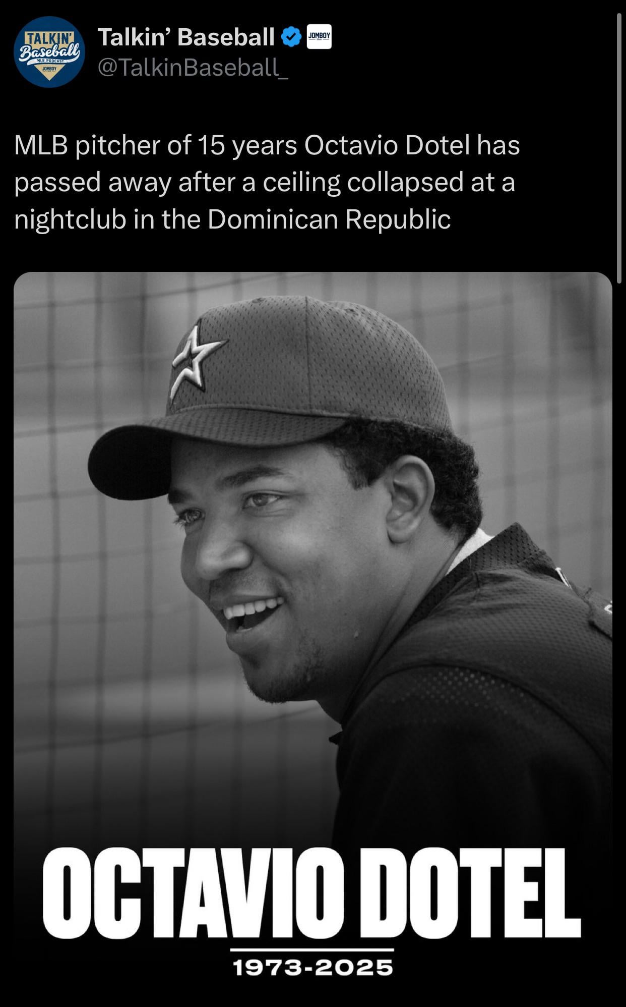 Octavio Dotel who pitched for the Astros from 2000-2004 including a no hitter against the Yankees in 2003 died after a nightclub collapse in the Dominican Republic.