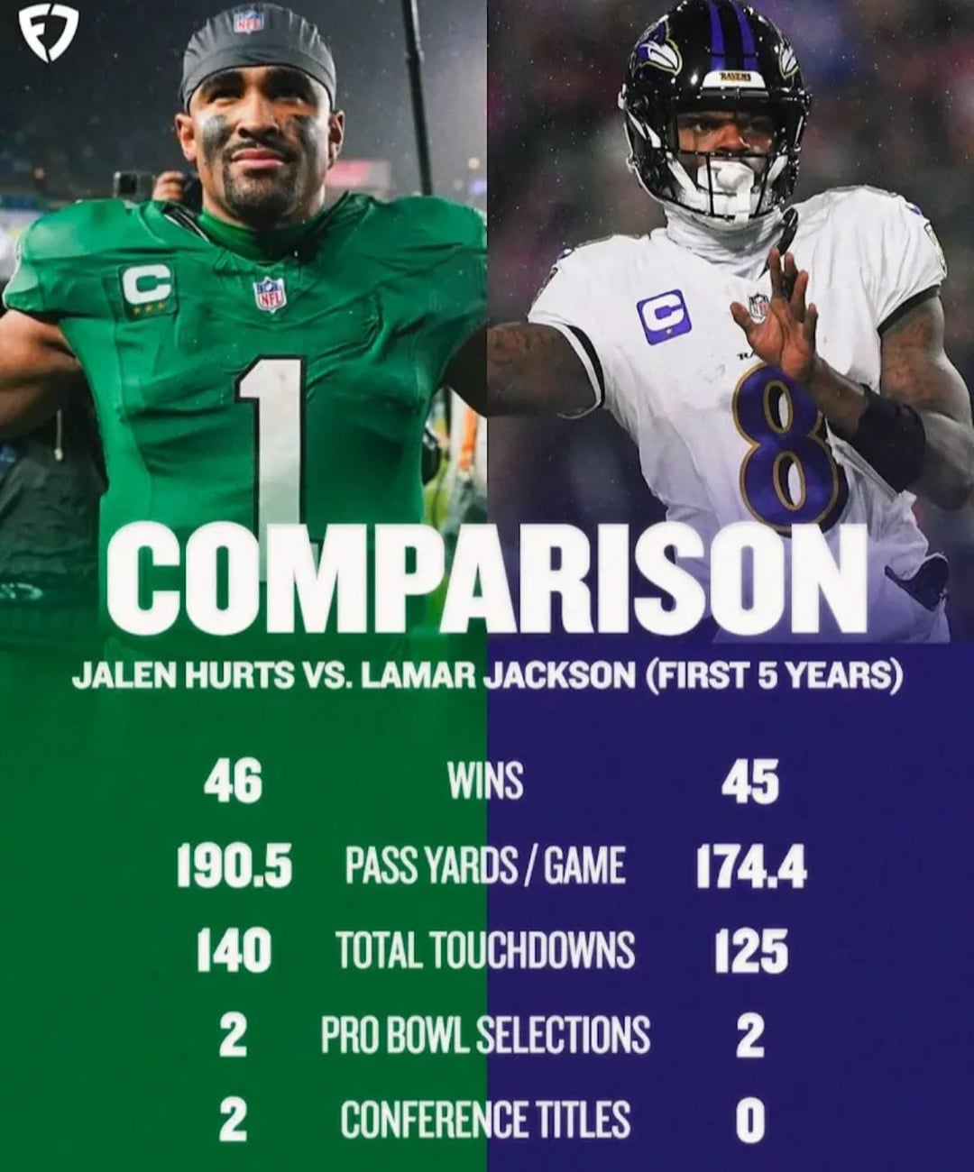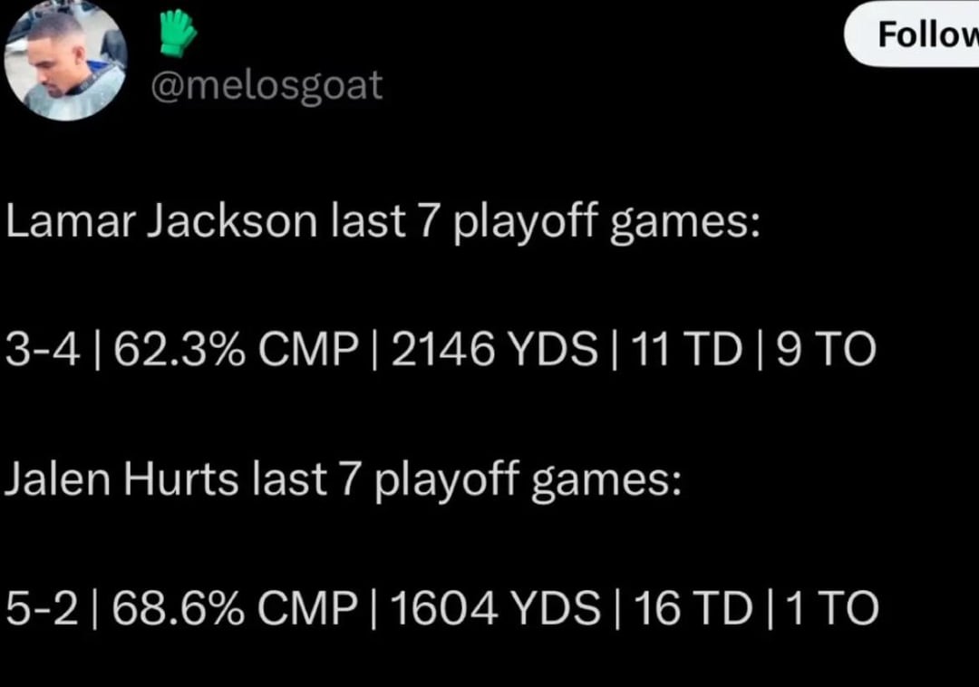 14. It’s fair to point the stats out but I also think it’s fair to look at what each team asks of their player. Guys like Lamar and Josh Allen are really asked to carry their team week in and week out and are surrounded by far less talent than some QBs. The chances of their team winning if they have a bad game is minimal which is why they’re in the MVP discussion each year. Hurts on the other hand was put in situations throughout the playoffs where, as long as he didn’t turn over the football, they’d be fine. Not taking away from Hurts being a great player I think it just helps to be surrounded by a great o line, defense, receivers and Saquon.