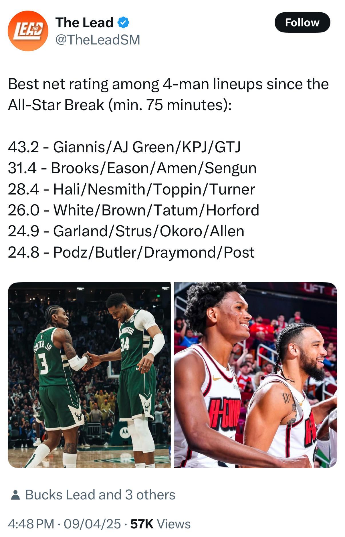 Sweet I look forward to Doc rolling out Giannis, Lopez, Kuzma, TP and AJ Green like has since the break………. That is exciting to see though!!