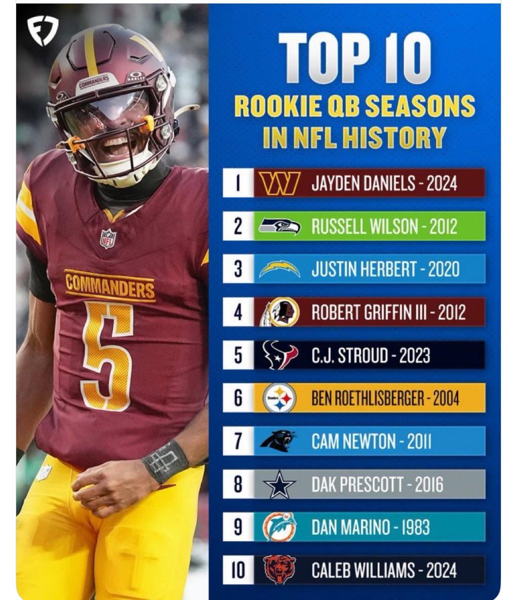 Caleb Williams LMAO. His stats look good on the surface, but his aversion to throwing the ball away or taking risks was a big reason he took 68 sacks. He shouldn’t be on this list and Luck should be on this list, even Baker Mayfield or Bo Nix should be on here over Caleb Williams.