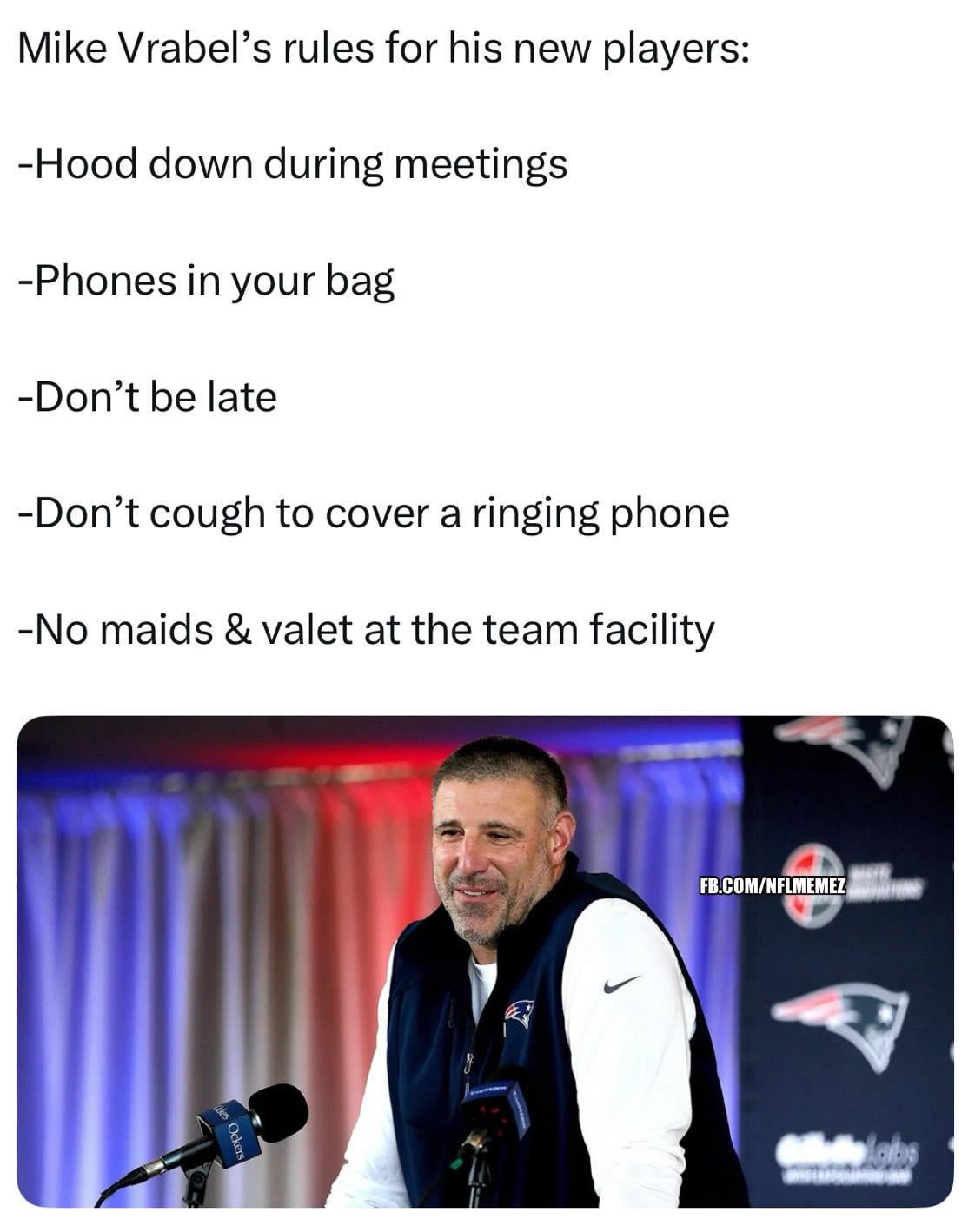 Mike Vrabel Rules for Patriots In Beginning His Tenure In New England! 7 comments -Mandatory Aaron Hernandez film study Is this a meme or something he’s doing? If it’s something he’s doing where meme? If it’s a meme where humor? Do they have to cough when a reporter’s phone goes off? Before you say “obviously it’s for their own device!” So then why not make it a rule to have all of the player’s devices silenced?  Maids and valets? Are there many 19th century British Aristocrats left in the NFL? Maids and valets sound like this guys stuck in the disco days Who is upvoting this, and why? Reported for impersonation of a meme. Leave a ReplyYou must be logged in to post a comment.