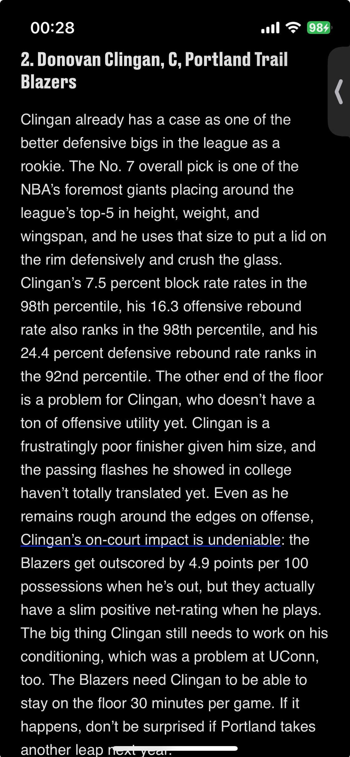 I’m very high on Clingan. Dude walked into the NBA as a slow 20 year old and is already doing some things defensively at an elite level. Most guys go their entire NBA careers without ever sniffing “elite” in a single aspect of their games. I am very interested to see how he develops physically and offensively in the next few years. If he makes big leaps in both those areas and stays healthy, dude can be an absolute force in the league.