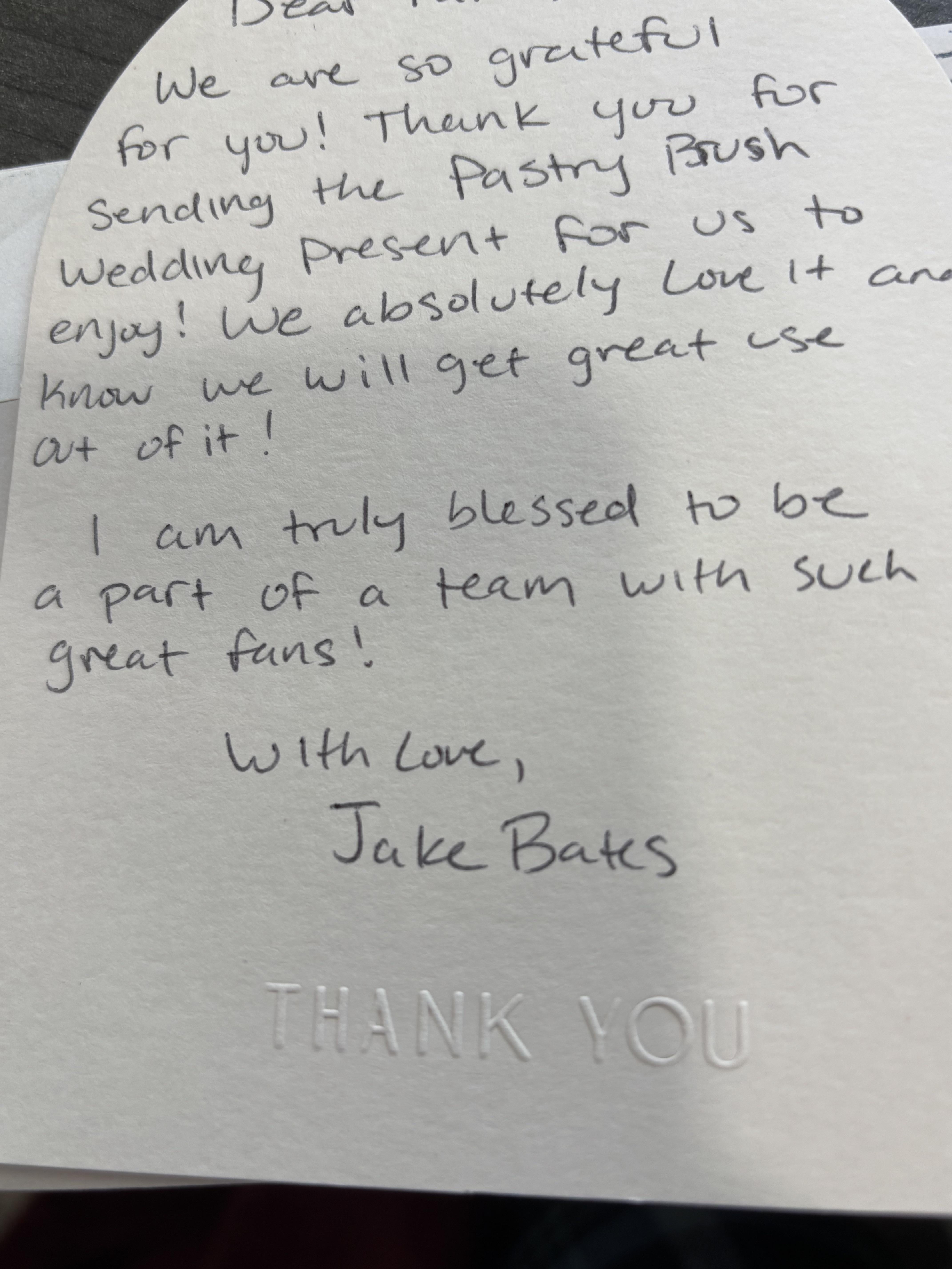I sent Jake Bates a wedding gift after his registry was posted here. I never expected anything in return and figured it was the least I could do for the joy he brought last season. I was so surprised to get this in the mail today.
