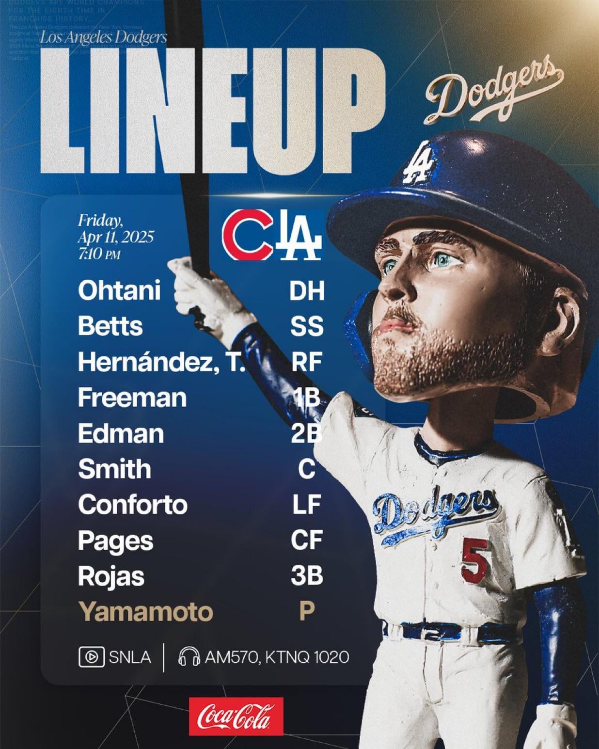 Tonights starting lineup (ft bobble head Freddie!) 18 comments Worth noting, we are facing Matthew Boyd who’s a LHP hence Muncy being out of the lineup and Freddie batting cleanup. Excellent protection for Freddie to see some good pitches today! Tommy and Teo both pretty hot at the plate Really hope Rojas brings his glove tonight.  I wanna see Freddie hit a HR on his bobble head night 🙏🏼 It’s so beautiful. Heck yeah! I’m so happy to see Freddie back!!! Why not put Enrique in CF? World Series Grand Slam Freddie. https://preview.redd.it/17sx4f8ebaue1.jpeg?width=1170&format=pjpg&auto=webp&s=3dcd2e48c951e4ba318ea9cf34d4ec4aaf7bfe36 GUESS WHO BACK Bobblehead kinda looks like Zac Efron Still Pages in CF? What the fuck Dave… Let’s fuckin gooooo Dodgerrrrrsssss Freddie’s bobblehead could be a character in Team America World Police. Lol  I’m hoping Freddie is truly ready, and they’re not rushing him back for the bobblehead night  Sounds good. But I still trust Muncy over Miggy at 3B and anyone but Pages in CF. So hyped for Freddie to be back!!  Ok good to know it’s safe to take a quick bathroom break between Pages and Ohtani at bats  Leave a ReplyYou must be logged in to post a comment.