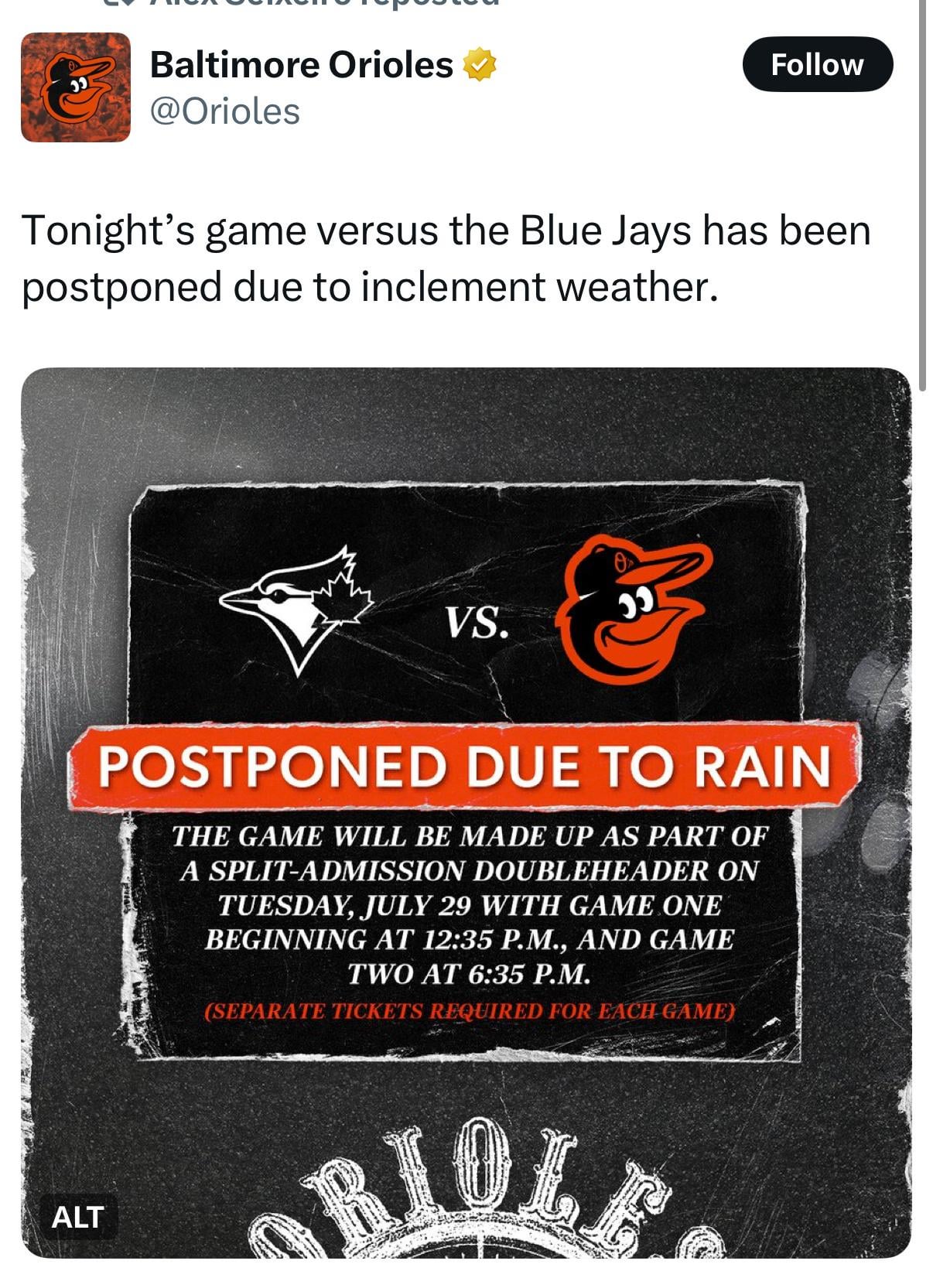 [Orioles] Tonight’s game versus the Blue Jays has been postponed due to inclement weather. The game will be made up as part of a split-admission doubleheader on Tuesday, July 29