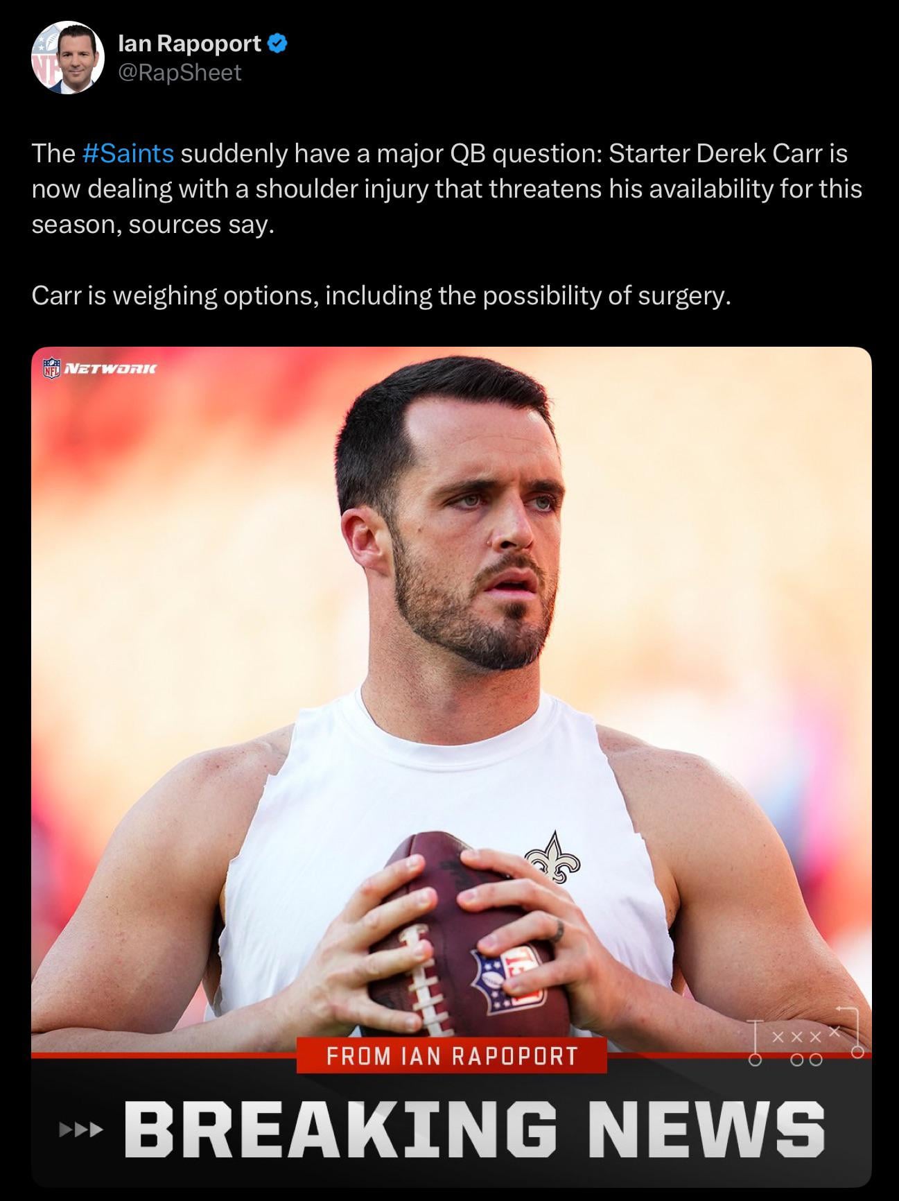 Honestly I kinda feel bad for Carr. He was being courted by the Jets in free agency, but they ghosted him once they realized they could get Aaron Rodgers. So Carr signs with the dogshit Saints while Rodgers implodes on the Jets. In retrospect, you have to think Carr would have been the better choice and given NY the half-decent QB play they’ve been searching for.