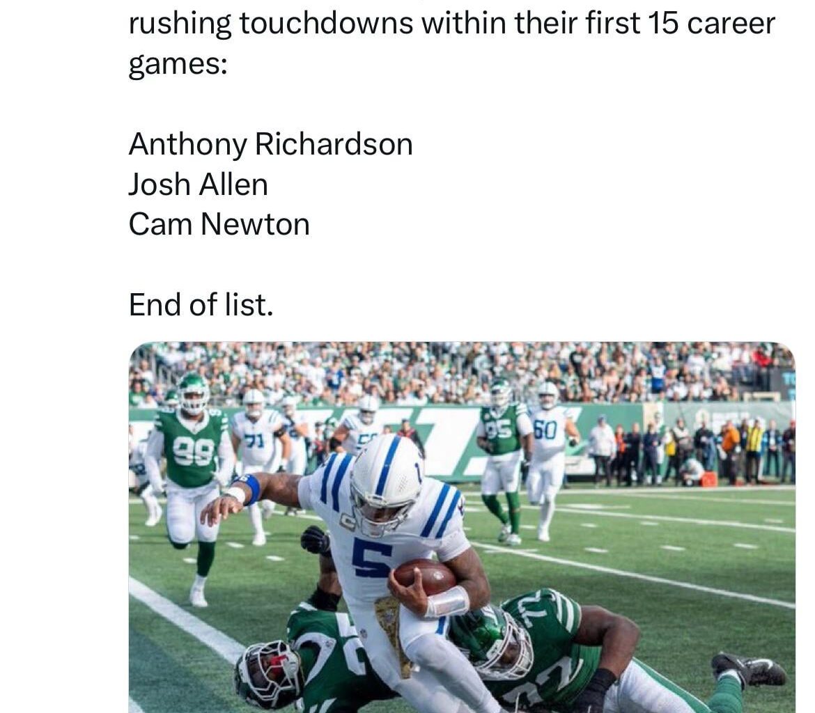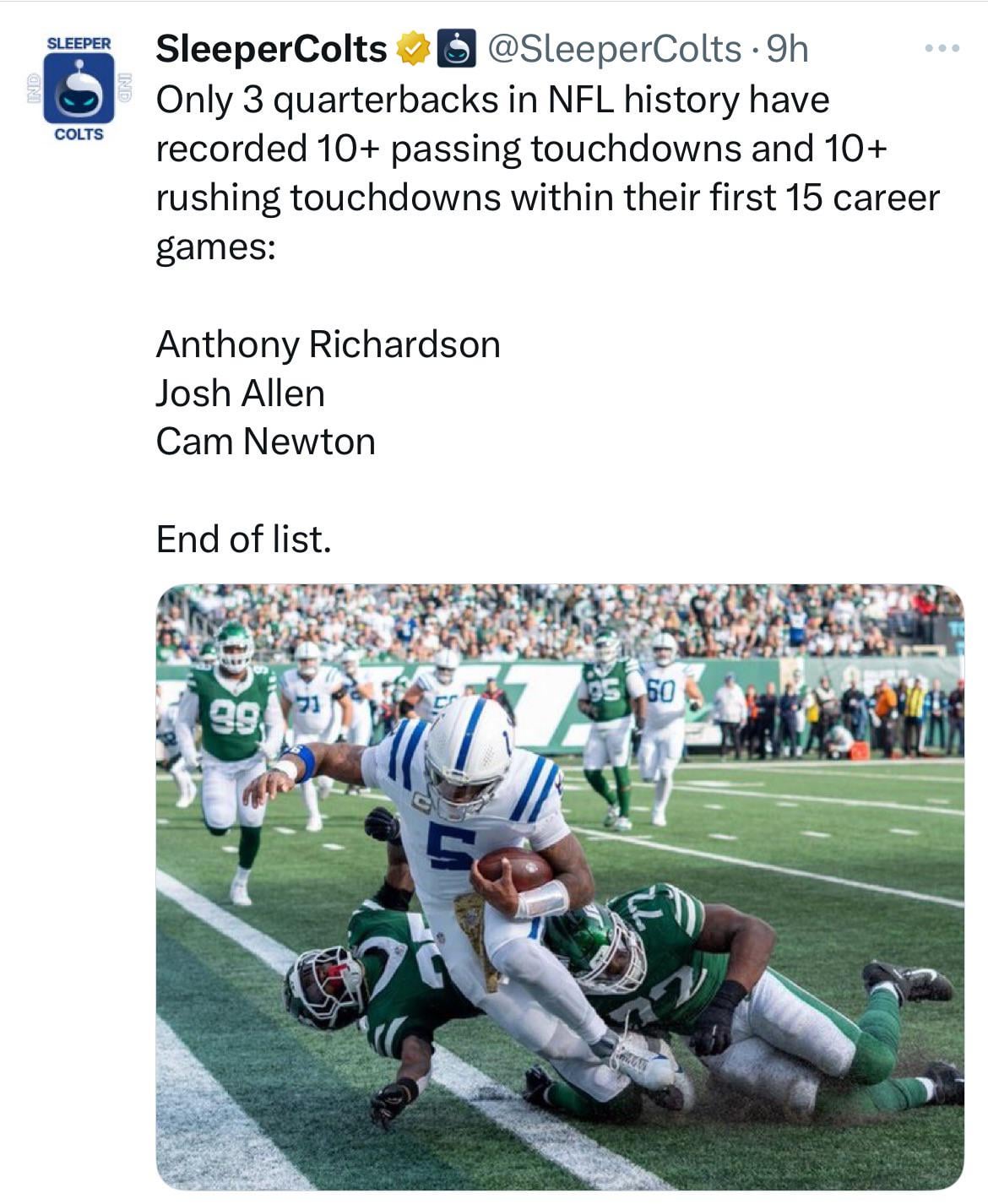 I truly believe we’re going to see Richardson make a leap this year. A leap into superstar caliber? Probably not. But I absolutely believe he will do enough this year for us all to have full faith in him as our franchise Quarterback. He had shoulder surgery his rookie year, so he really wasn’t able to develop his mechanics or even throw for a long time for last offseason. Now he’s getting a full, HEALTHY offseason, he’s working with the same biomechanics guy Josh Allen works with, he’s got Daniel Jones to compete with, and based on how much he improved after the benching last year, I’d imagine having Jones there is going to light a fire under him. He went through the benching, we’ve heard vets on the team say he responded to it well and has responded well to talks they’ve had with him, so I believe he’s going to mentally dial in and really grow in that regard as well. On top of that all, he’s still YOUNGER than Quarterbacks that are going to be getting drafted THIS YEAR.