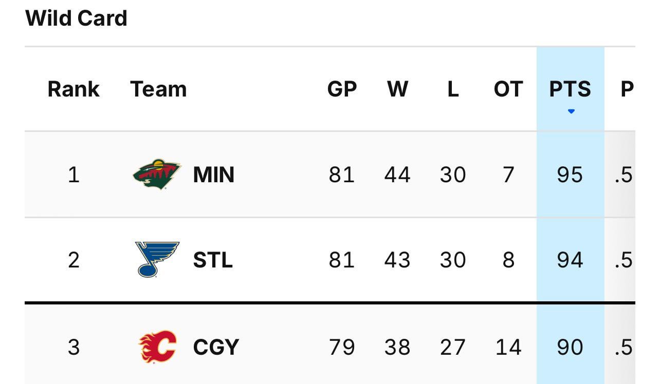 If the Blues win next game against Utah (they're at 96) and the Flames win their next three (they'd also end at 96). The Minnesota Wild can get kicked out of playoffs by a Ducks regulation loss.