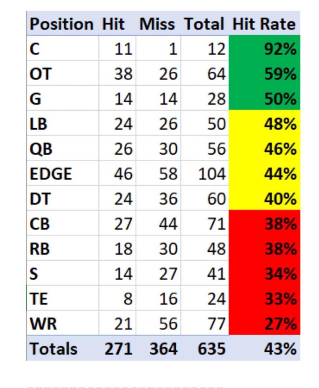 NFL Draft “Hit Rate” by Position in the 1st RD…(according to ESPN & PFF) 2 comments Comparing both of their data, seems like EDGE, WR, CB, and RB are the most bust-worthy positions drafted in the first round historically It makes sense that Center would be the least likely bust. If you’re taking one in the first, you have to KNOW he’s that guy. Leave a ReplyYou must be logged in to post a comment.