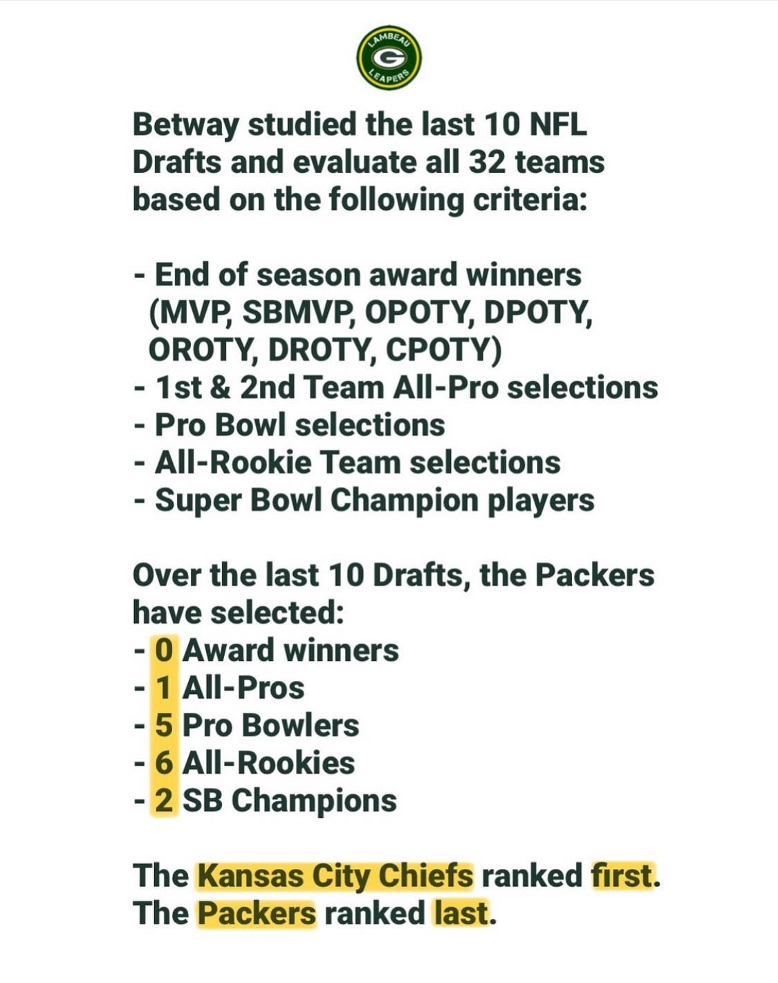 Chiefs had mahommes. One player can change that whole list. Packers are 32 and the bears are 28th have the bears drafted well in the last 10 year no. There aren’t many bears fans that wouldn’t trade their drafts for ours.