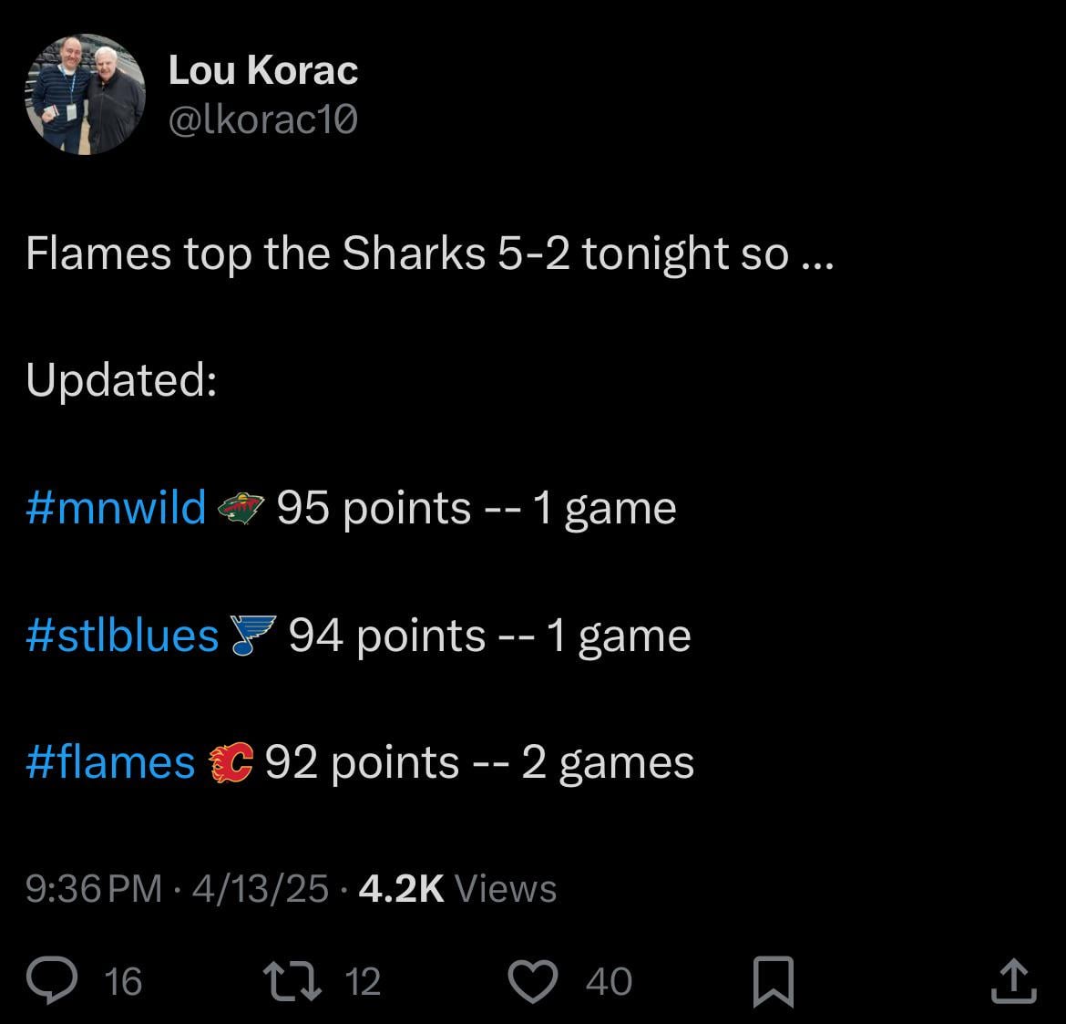 Not a good bet on another team that has clinched to beat Calgary. Short of us winning it’s going to take a miracle. Borderline miracle for us to close a game vs the yotes in regulation. We’ve lost our mojo.