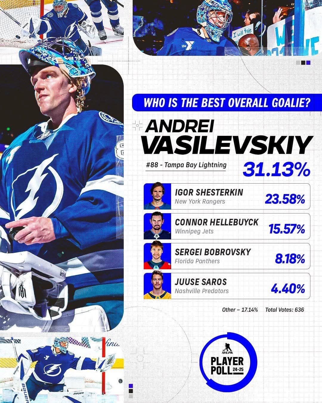 Vasilevskiy *is* the best overall goalie. I agree. (…but wasn’t asked.) I am surprised though that Hellebucyk only received 15-16%.