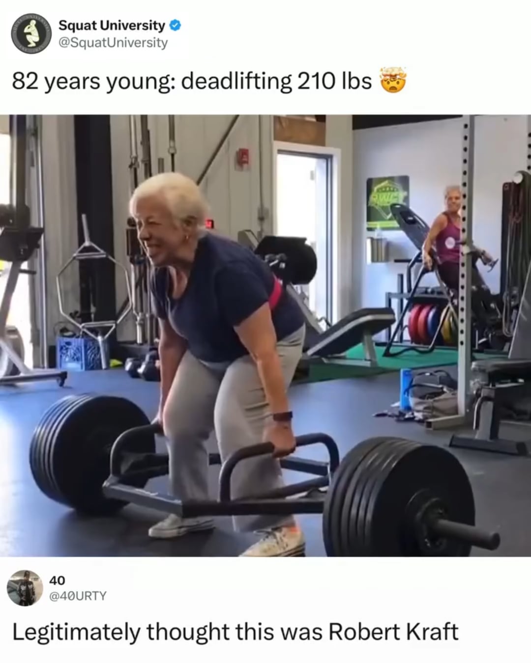 🤯 7 comments She can deadlift more than me, pardon me while I go kms It’s uncanny tbh lol After his happy endings, he can do anything. Robert Kraft doesn’t have that kind of grip strength, but he likes to get massages from women who do. Go granny!!! Squat U sucks. Slop Leave a ReplyYou must be logged in to post a comment.