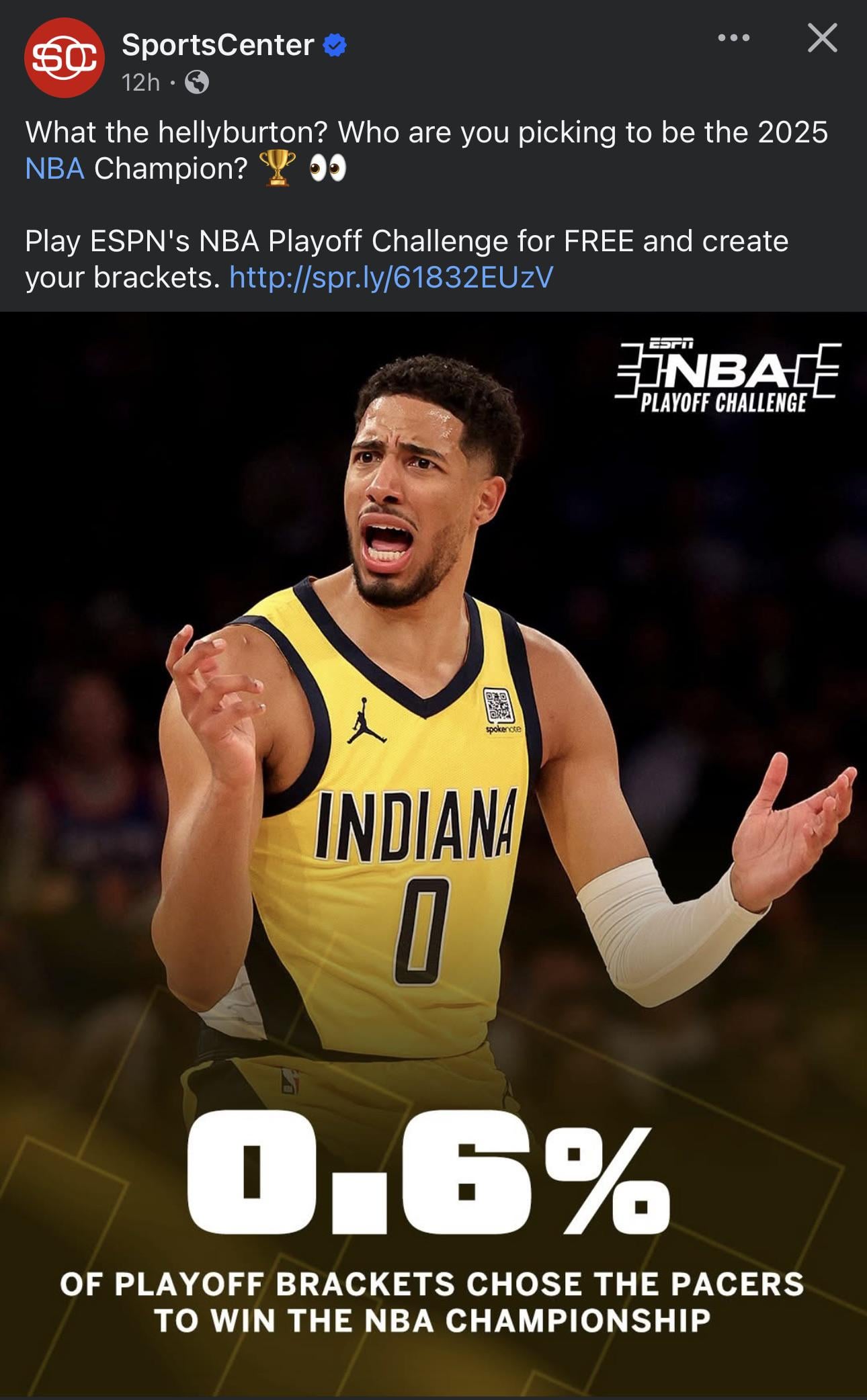 You’ll know if you’re lying to yourself. Genuinely ask yourself, do you think the Pacers have the best odds, or even top 3 odds at winning the championship this year? If no, do you expect someone who doesn’t even root for the Pacers to have more faith in them than you do?