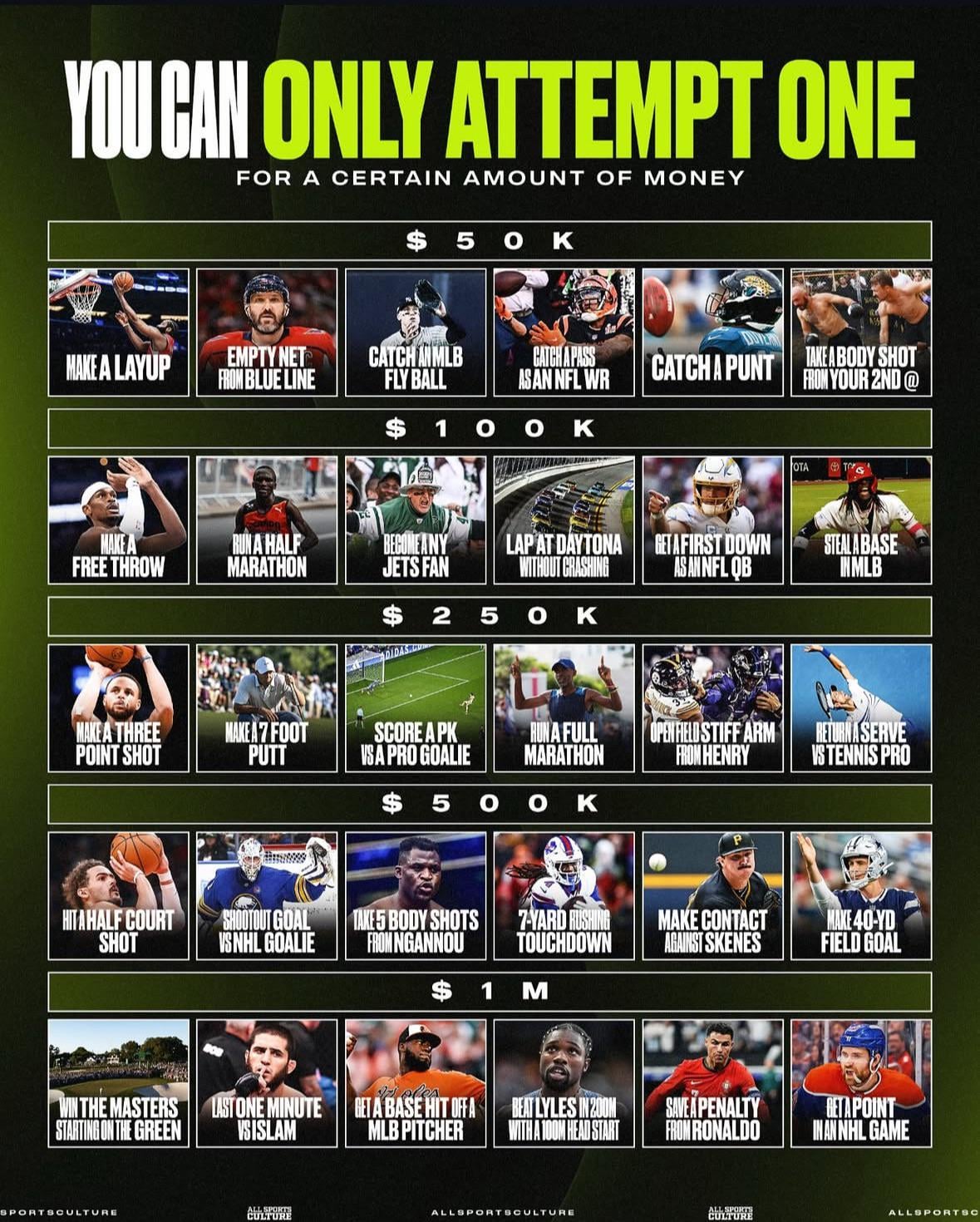 I mean… run a marathon? Idk most of 250k is doable for anyone with some practice in those sports, except the PK.