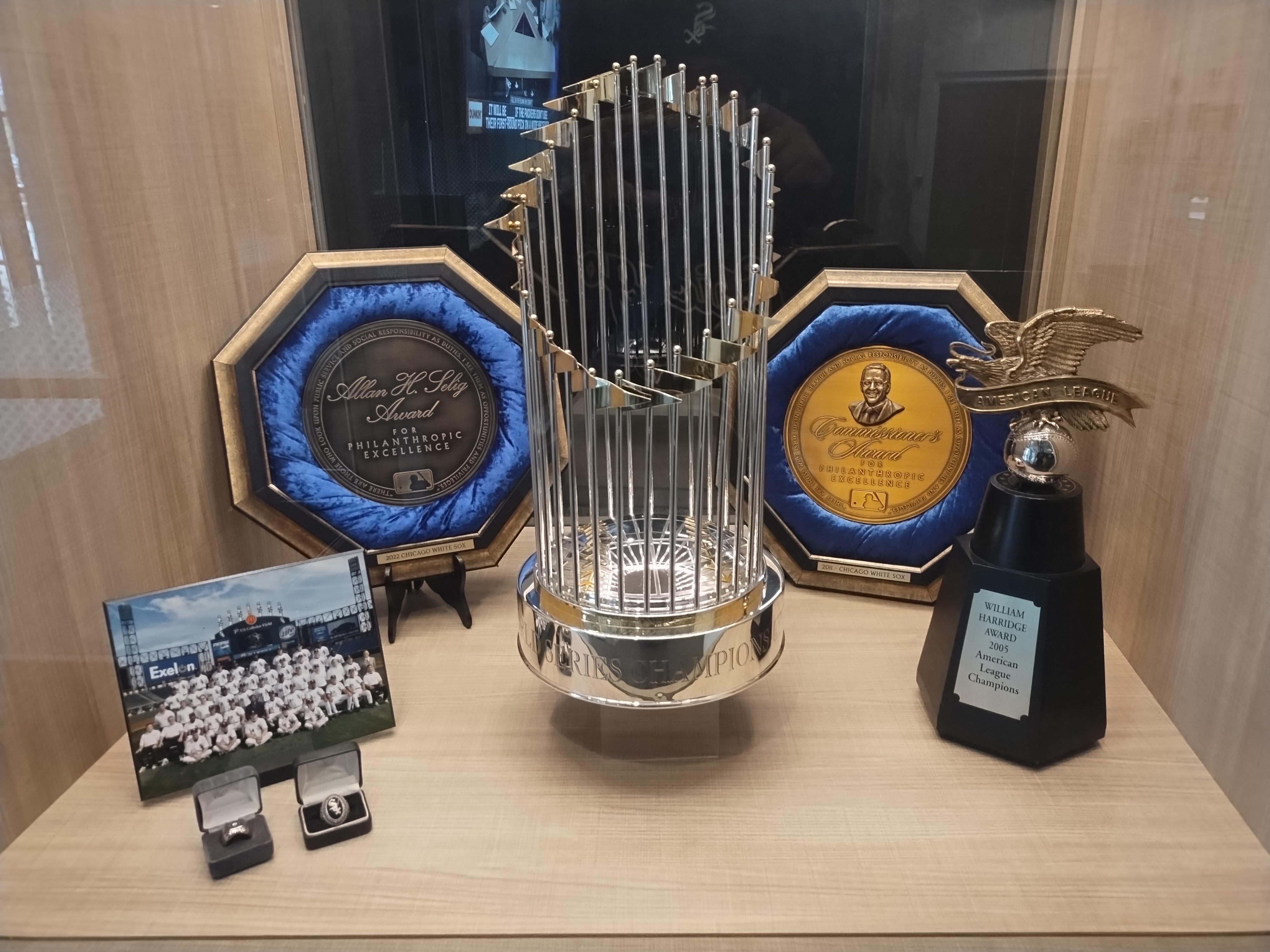 Thatβs the 2005 AL Pennant alongside the WS trophy. Is that in the lobby area behind the home plate entrance? I think the 1959 pennant is in a nook next to this one but itβs been a while since Iβve been there. Very cool.