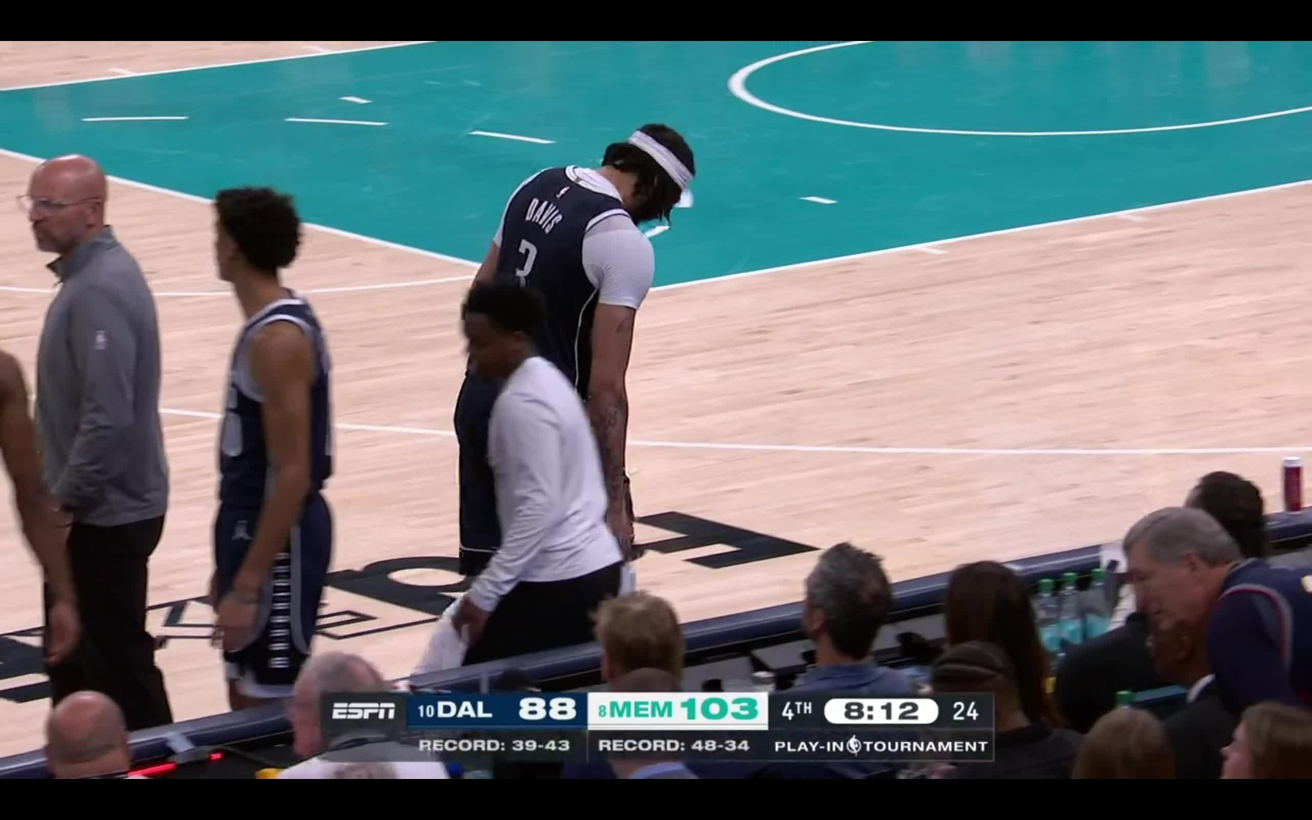 Down 15, Anthony Davis airballs a three, walks gingerly to the bench, Nico Harrison reacts