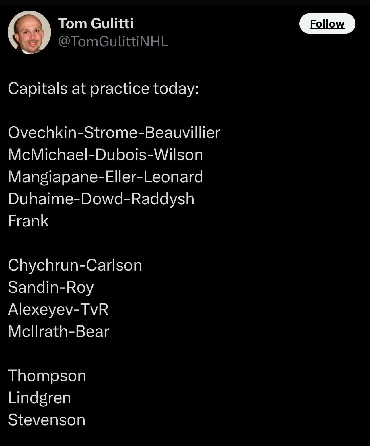 Great news on Thompson. Being ready for game 1 is huge for goalie momentum (mainly i don’t think lindgren holding more games because of momentum is a good thing at all for our playoff chances).