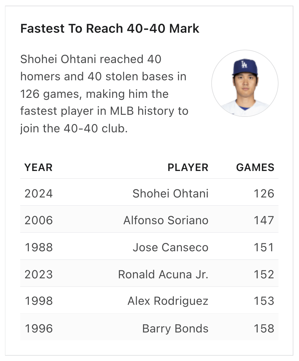 Not only did he reach 40-40 the fastest, but he did it in 21 fewer games than the previous record!