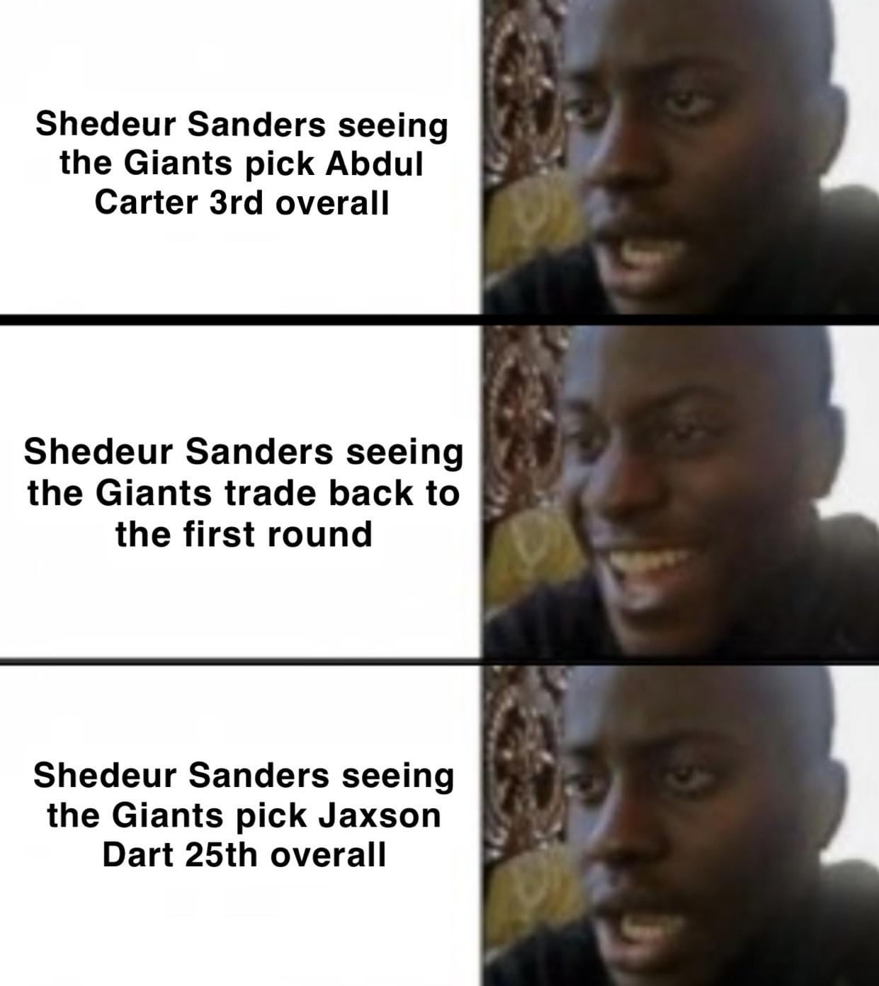 God i want to see the moment that draft party found out 1) NYG trading back up and 2) They’re picking Dart. Especially Deion’s reaction. Its brutal but i feel like they’re collective ego needed this.