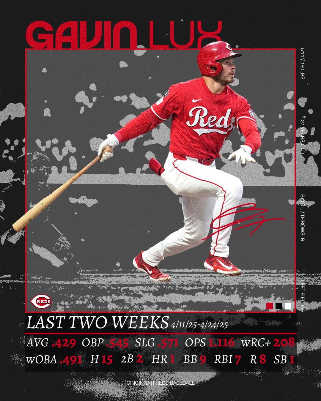 Reds fans, we might’ve found something here. Lux has been absolutely locked in — .429 average, 1.116 OPS, and just a total spark in the lineup these last two weeks. Early returns are looking real good… how are we feeling about the trade now?