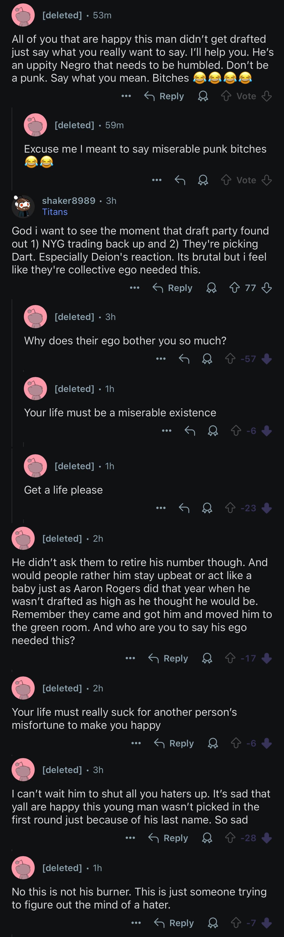 This account became active for the first time and immediately started crashing out defending Shedeur Sanders. Clearly had no idea how Reddit works, replying to the same post repeatedly. Promptly deleted his account after being accused of being Shedeur Sanders.