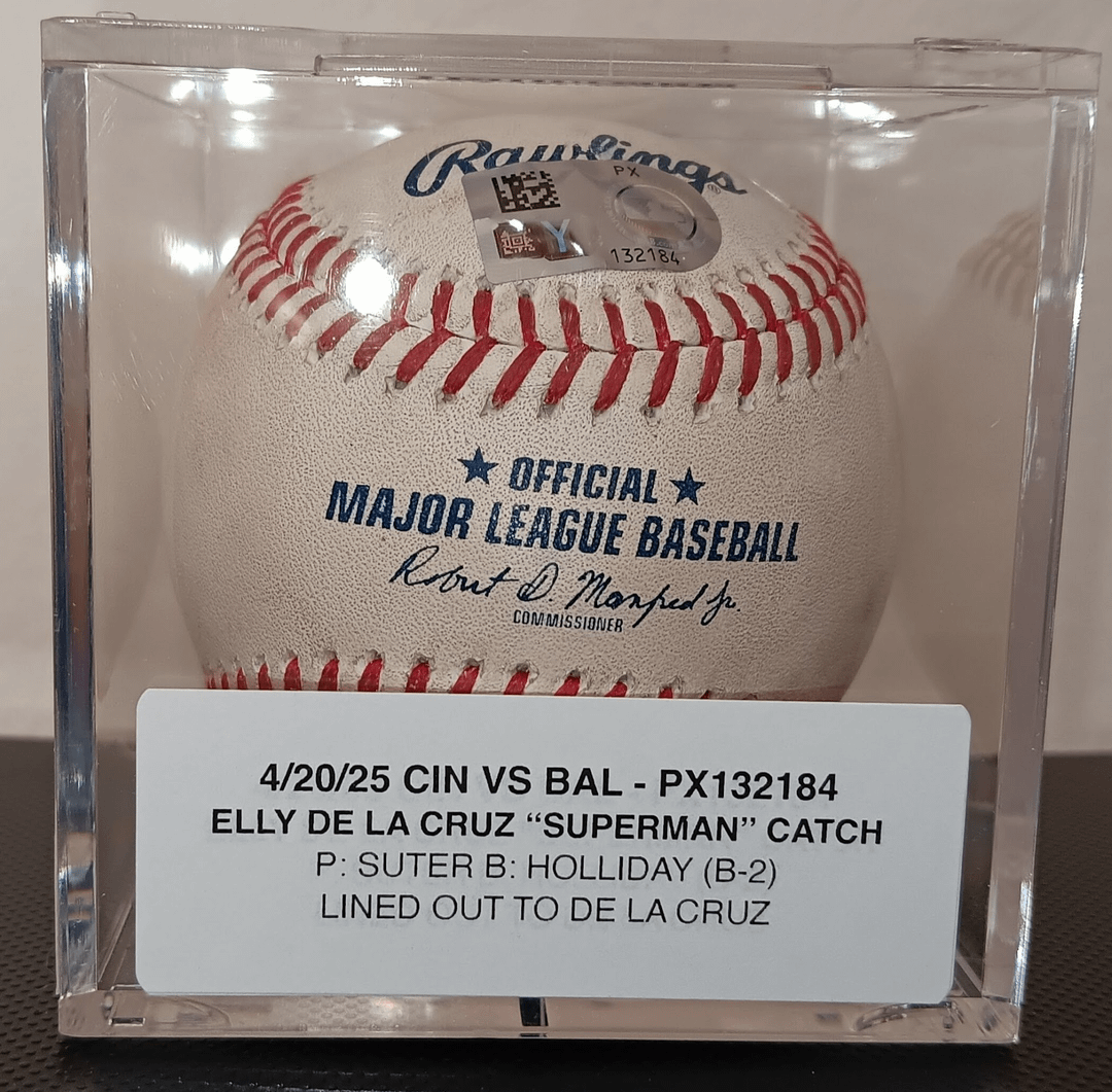 Pumped to land this! Elly De La Cruz “Superman” diving catch game used baseball. This is the actual baseball in that play, Jackson Holliday rocketed the ball straight to the gap where Elly made this incredible play.