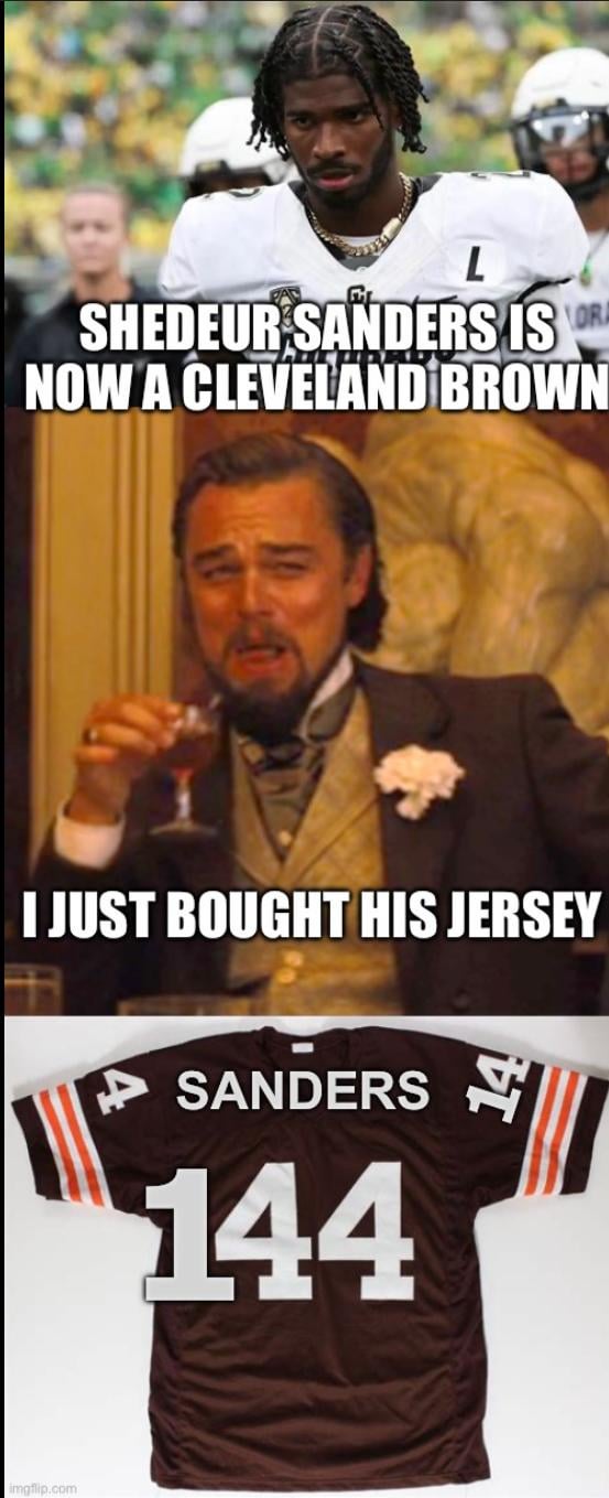 Get Yours Today! 6 comments Iām going to hang it up right next to my Tim Couch jersey and my Johnny Manzel jersey Can we see that guys jersey with every Browns QB now that they have 4 more? Gross. You mean Slide Sanders š Terrible use of this meme. Number 144 is already retired by the Browns. Leave a ReplyYou must be logged in to post a comment.