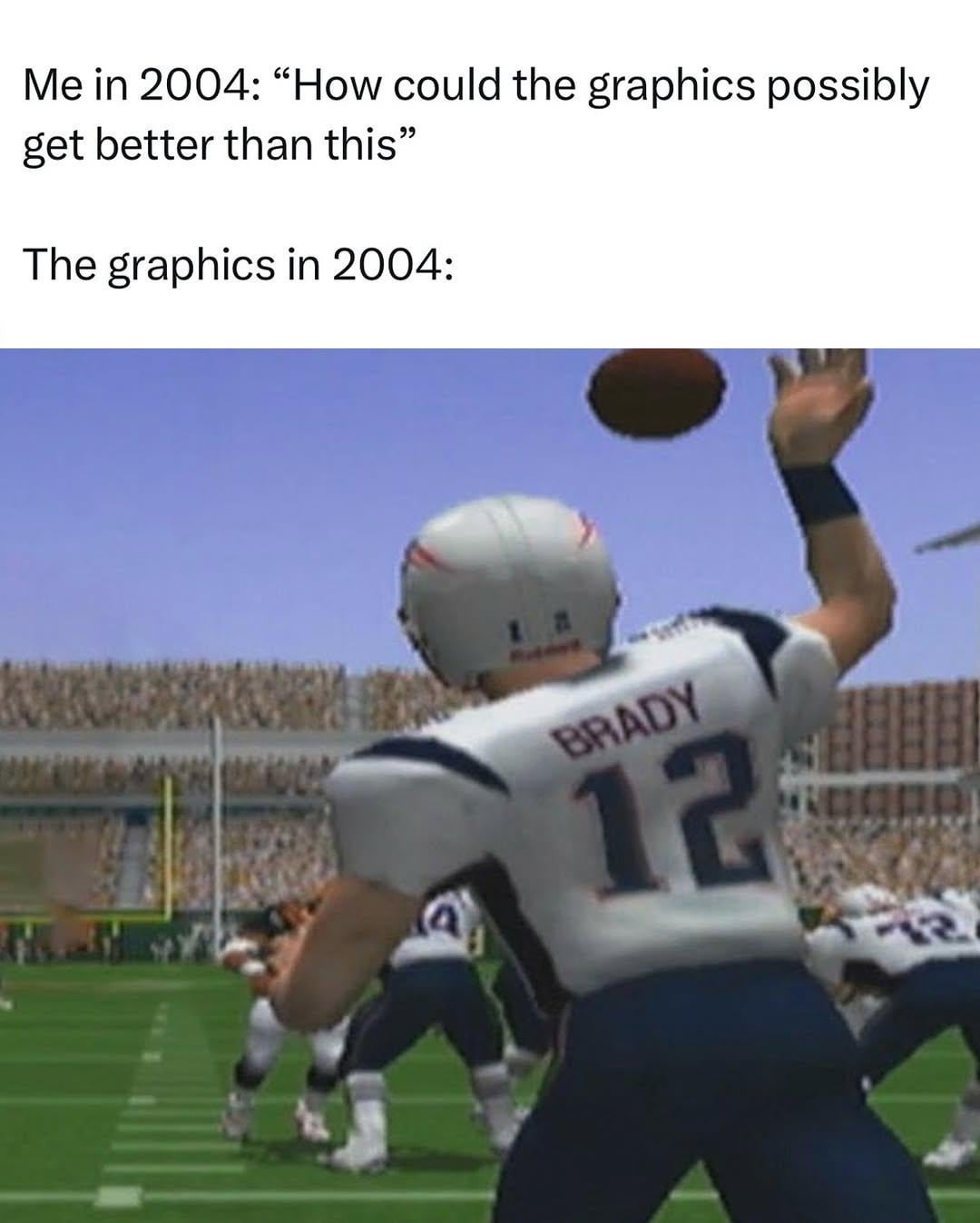 The graphics in 2004 …. 5 comments And they genuinely didn’t need to get any better. Games peaked in the 2000s no actually. my friends & i said this multiple times after playing ps1 & n64 for years. ps2 graphics were absolutely mind blowing as a 10 year old Tbh once I was able to see the names on the jerseys I was content The real question is whether that’s a forward pass The gameplay never got better than 2k5 Leave a ReplyYou must be logged in to post a comment.