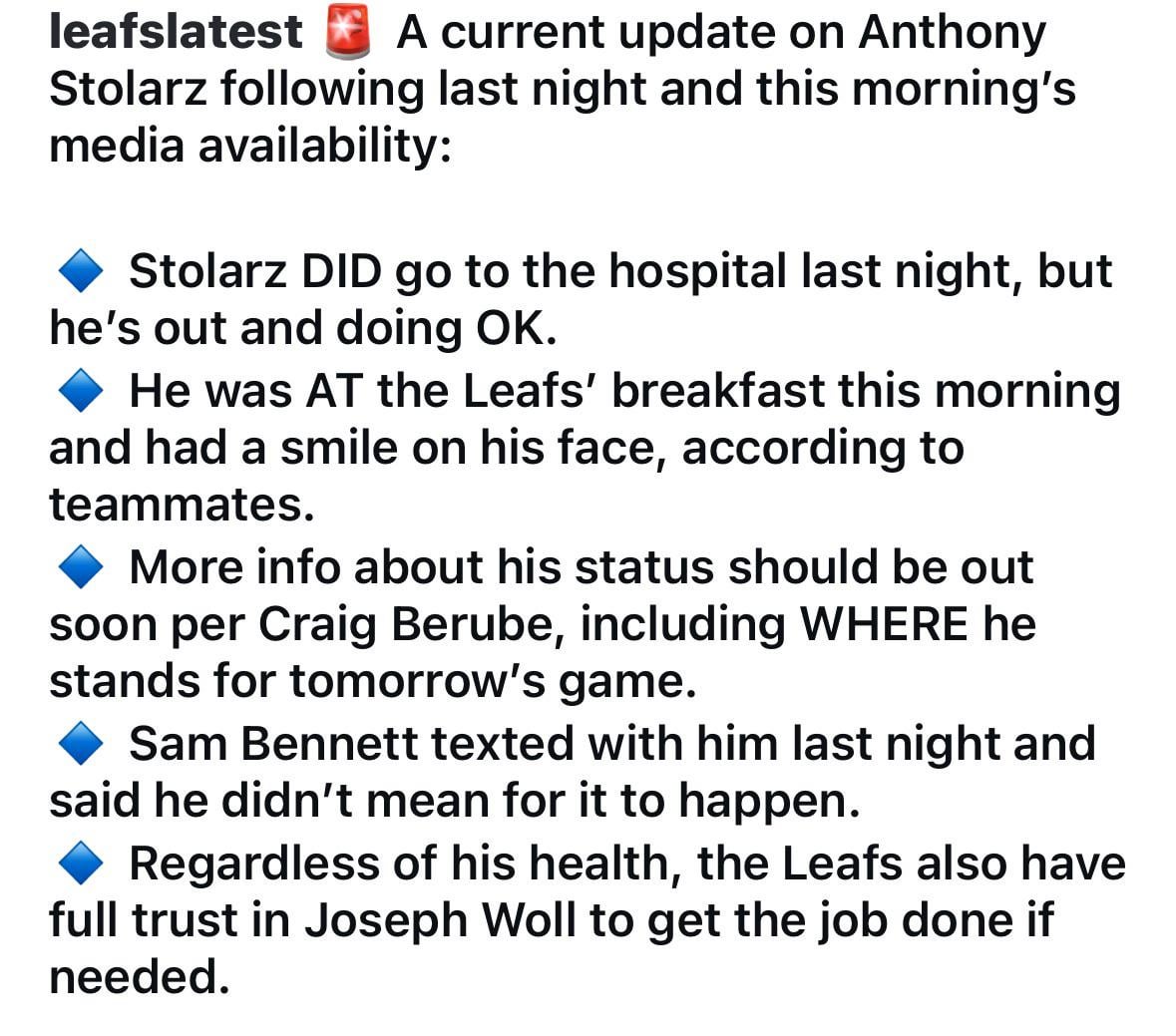 Play it safe, Woll is capable especially not coming in cold after not playing for a few weeks…. No need to rush stolarz back but I hope he’s ready to roll for game 3.