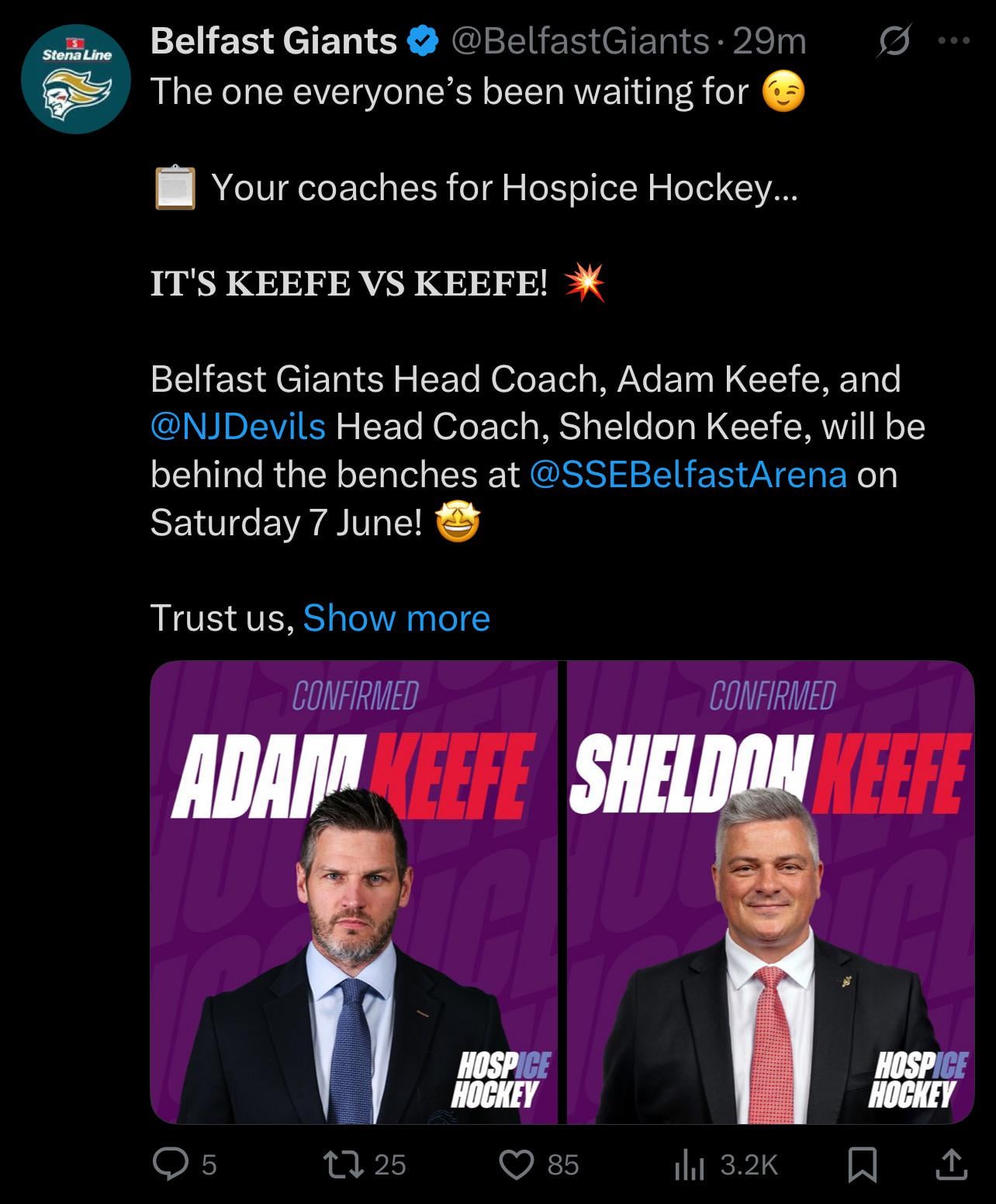 There will be a battle of the Keefe brothers this offseason in a charity tournament in Belfast! 4 comments Brodeur vs Cech would have been an incredible thing to see.  Hospice Hockey is a great description of our team’s shoulders Good hair in that family Leave a ReplyYou must be logged in to post a comment.