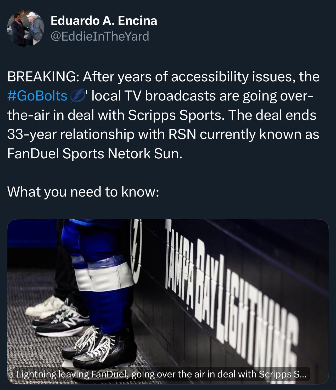 [Encina] BREAKING: After years of accessibility issues, the Bolts’ local TV broadcasts are going over-the-air in deal with Scripps Sports. The deal ends 33-year relationship with RSN currently known as FanDuel Sports Netork Sun.