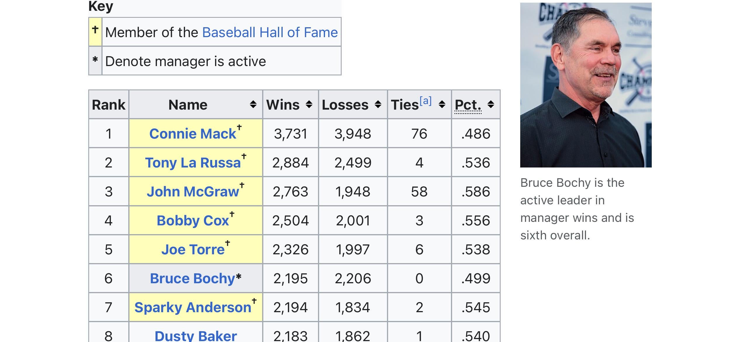 Congrats, Boch! Now alone at 6th in all-time wins 3 comments Next closest in wins among active managers is Terry Francona at 1,971, which is 224 back of Bochy. Unlikely he will reach 5th place unless he coaches 1 more year. Hope we can get him above .500 before he retires. Who is connie mack and why is she listed #1 Leave a ReplyYou must be logged in to post a comment.