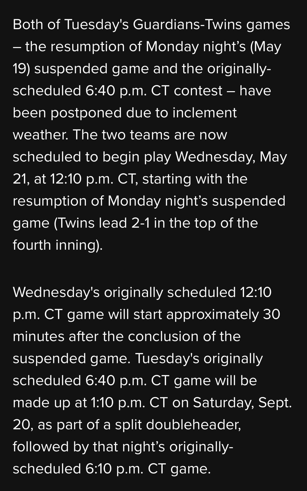 Today’s game are postponed, DHs scheduled for tomorrow and September 20th per MLB 17 comments FUCK.  Honestly not mad about it. They’ll be super fresh tomorrow. GODDAMNIT ENOUGH WITH THE DOUBLEHEADERS ALREADY Ballgame x2 The absolute worst case scenario. Now you go into the Tigers series coming off the DH, and then right into Ohtani. Woof. Hope they rest well and get their heads right tonight. A double header while I’m on a flight back from Asia in September? That’s one way to kill 6-7 hours worth of a 20 hour flight Just play a triple header Mother Nature needs to cut the shit, she’s got it out for us this season. They should just do a triple header. What they sound have done yesterday Fuck!!! This sucks! Not ideal with us having to face the Tigers 4 times this weekend Gotta hope we blow out the Twins both games tomorrow so we don’t burn our BP for the Tigers. This plus the Bazzana injury  ok hear me out: Guards play no more regular season games. just try to make the playoffs at 25-21. This team needed a break well, dang still, guess it’s good to find out now and not when I expect the game to start… Since when do we RESUME suspended games? Normally the slate is wiped clean. Adding a double header to the last week of fantasy baseball on my stacked guardians team, yes please I will selfishly take this Leave a ReplyYou must be logged in to post a comment.