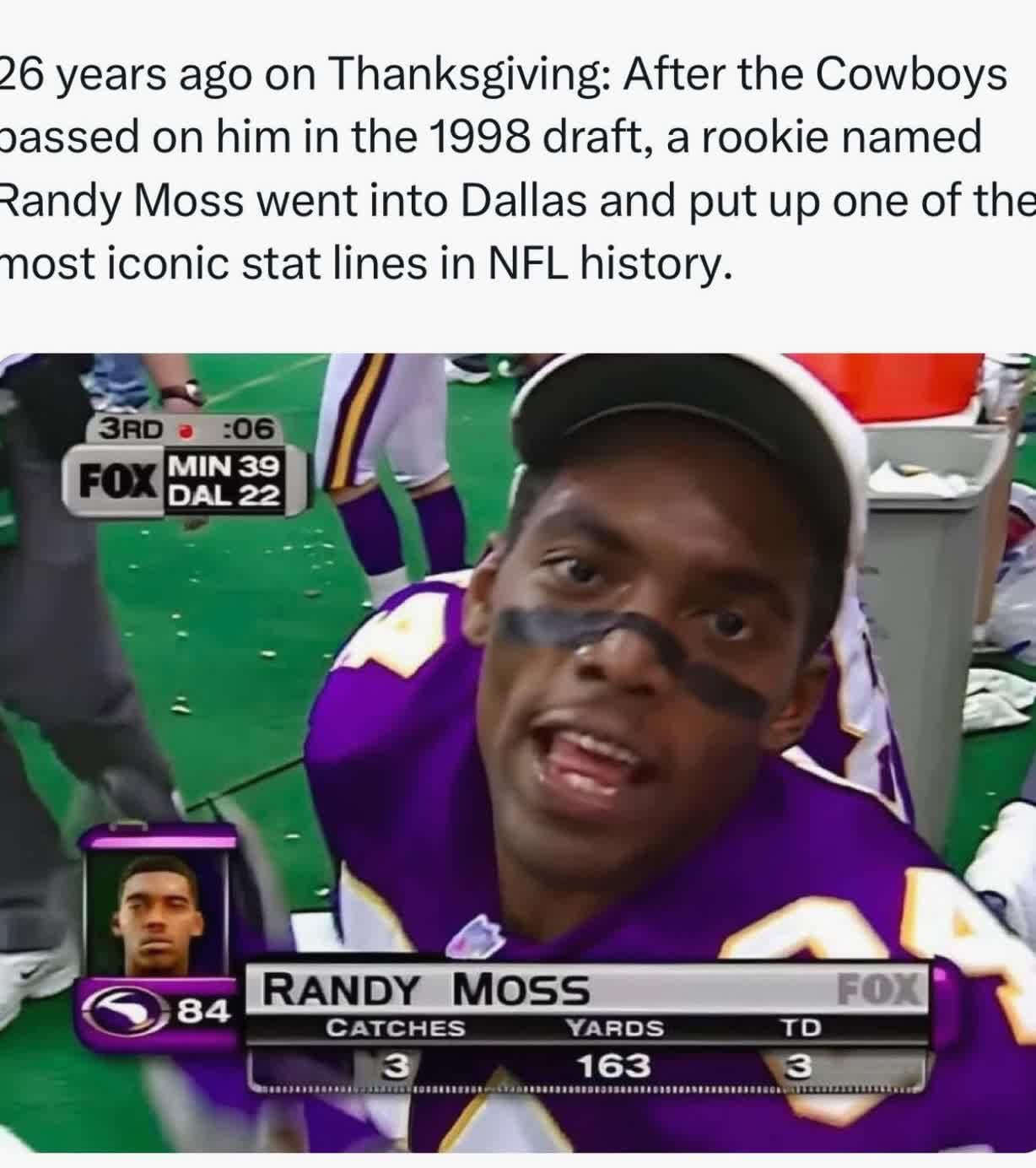 Fun fact, Randy Moss is undefeated against the Cowboys and put my childhood self on (metaphorical) suicide watch.