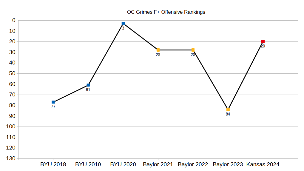 Fickell hired OC Grimes to replace Longo. I’ve charted several of Grimes’ games over the years at his previous stops — most recently Kansas, the three years before that at Baylor before being dismissed, and the three before that at BYU just before his QB Zach Wilson was drafted second overall — due to film study projects reviewing common opponents and Big-XII defensive transfers. I haven’t been wild about what I consider an overly simplistic playbook that requires the QB’s athletic gifts to bail him out a lot. But I’d still consider Grimes an improvement over Longo, for whom I’ve consistently had similar criticism but additionally felt had little cohesive downfield play sequencing; Grimes at least brings an eagerness to stretch the field vertically which can certainly produce some big if inconsistent results when it clicks: