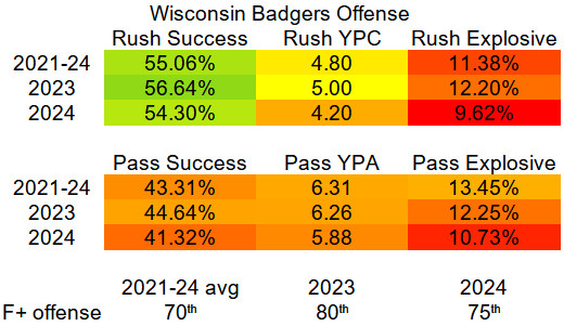 I wrote my in-season preview of Wisconsin nearly at the end of last year; as it happened the Badgers fired their offensive coordinator immediately following their game with the Ducks and missed a bowl for the first time in 22 years. That means the remainder of their campaign after publishing that article was very short and presented little useful data to revise what we knew about their 2024 season. As such my conversation with Rohan was light on catchup and focused mostly on what the offseason changes have been for 2025, and this article will as well. For readers looking to re-familiarize themselves with how Wisconsin performed and what the ups and downs under head coach Fickell had been last year I’d recommend reviewing that in-season preview.