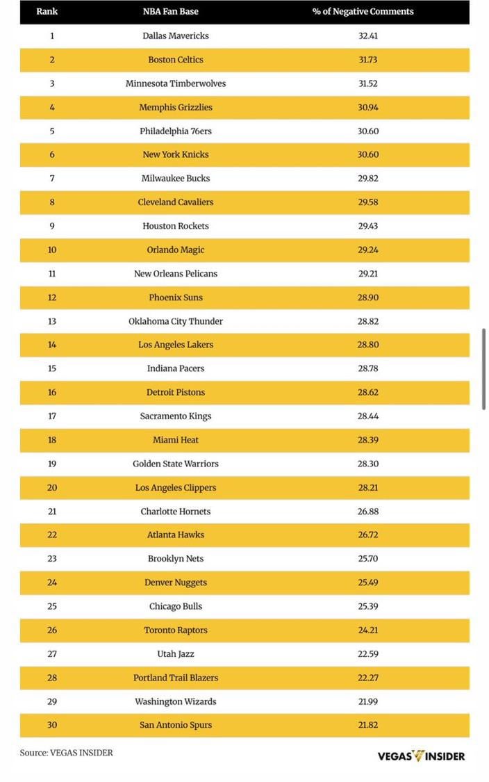 If you’re a bad team, no one is going to say negative stuff because they see what everyone else is seeing lol if you’ve had Pop for 24 years, you aren’t questioning 💩! These are weird metrics to gauge this info & hardly think it makes Spurs most positive fan base in league.