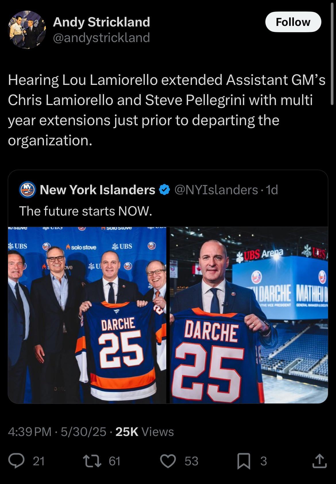 So obviously it makes sense to want CL gone but I feel like people put way to much stock in his role. Islanders draft the majority of the players, the Islanders okay BP roster players, the Islanders sign off on everything they do. He isn’t working independently there. He’s there to support the day to day operations of the Bridgeport team. He’s not making any organizational decisions without the Islanders GM’s final say. With Darche here now, Bridgeport will be run how Darche wants it to be ran. If Chris lamerello can keep the books properly it almost doesn’t matter if he’s still here now that Darche is here.