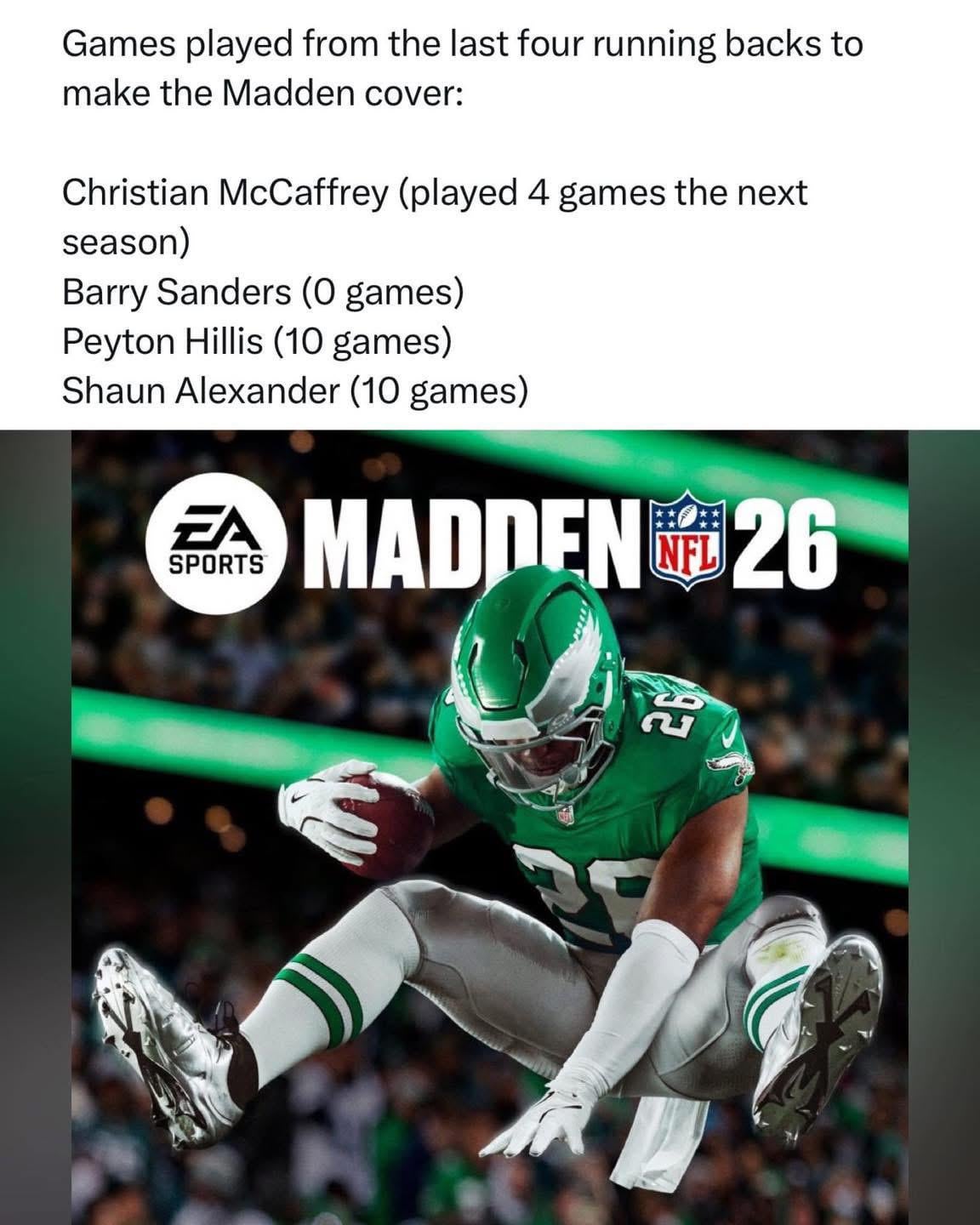 The curse is real, Adrian Peterson was Madden 25s cover athlete and only played 14 games for only 1,266 yds barely 11 total TDs and had to go to the pro bowl. Saquon is cooked!
