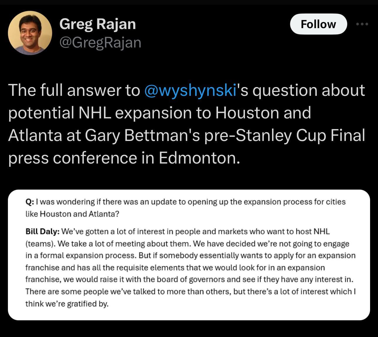 3. So essentially the same thing Daly said a couple of weeks ago when he was asked about it. Atlanta is going to present their argument for a team to them after the playoffs. I doubt anything different will be said by Daly/Bettman until after then.