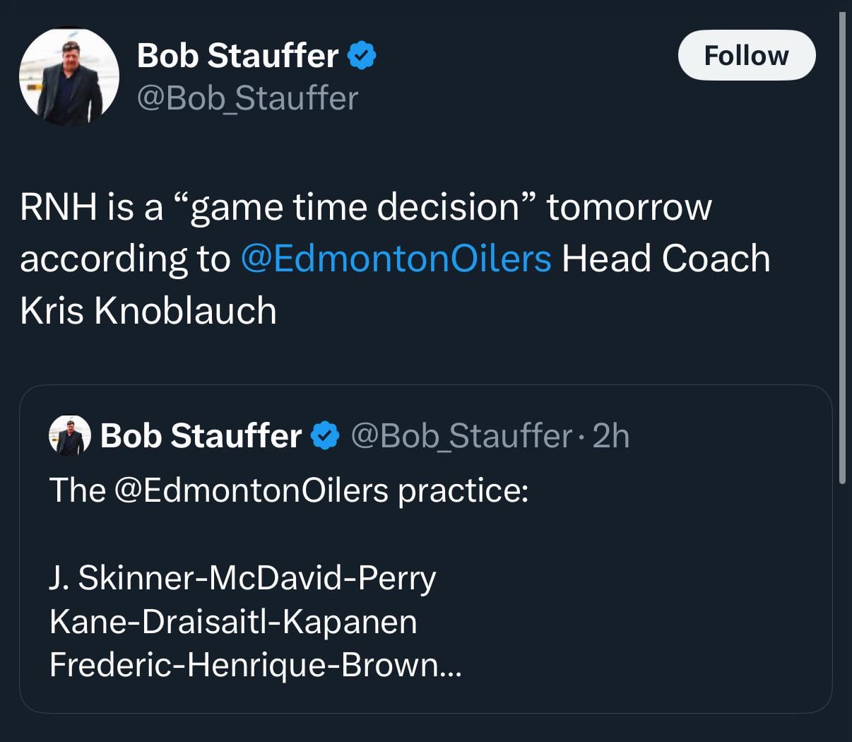 via @Bob_Stauffer on Twitter. RNH game time decision for Game 3. 1 comment He’ll play Leave a ReplyYou must be logged in to post a comment.