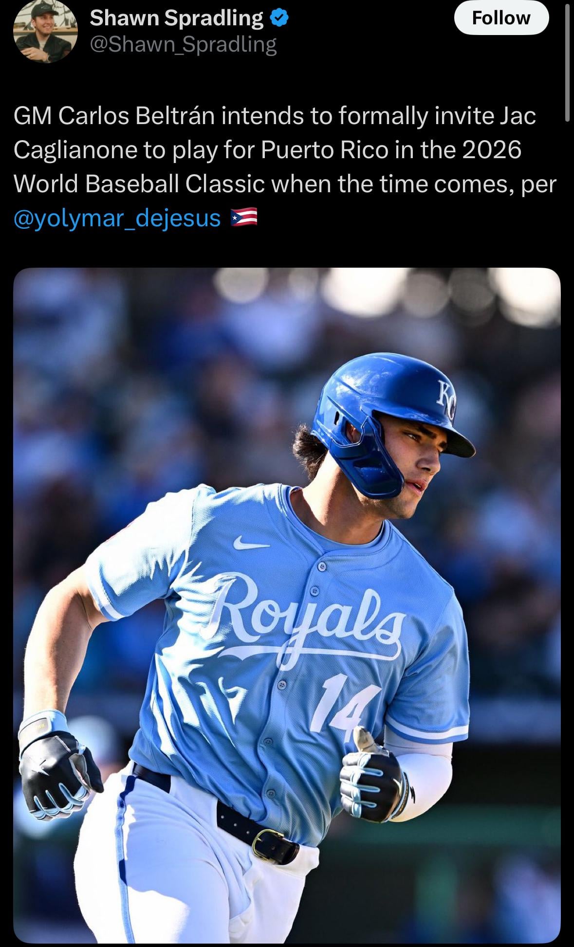 “GM Carlos Beltrán intends to formally invite Jac Caglianone to play for Puerto Rico in the 2026 World Baseball Classic when the time comes, per @yolymar_dejesus 🇵🇷”