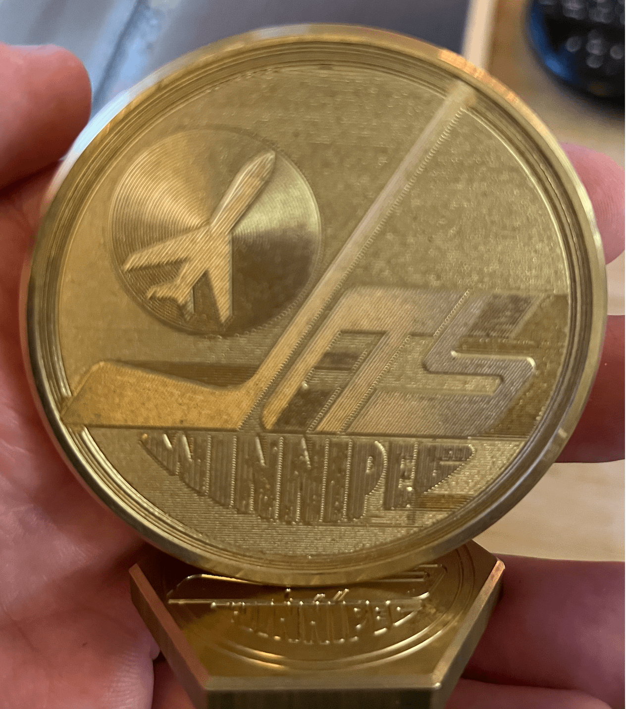 My husband, the lifelong Canucks fan(!), gave this to me for Christmas last year. He made it himself and had my favourite franchise logo etched onto both sides. It's super heavy, so he also made a custom base to hold it. I love it, but I don't know what to call it. It almost looks like a little award. Regardless, I can't wait for next season when it will once again grace the mantle!